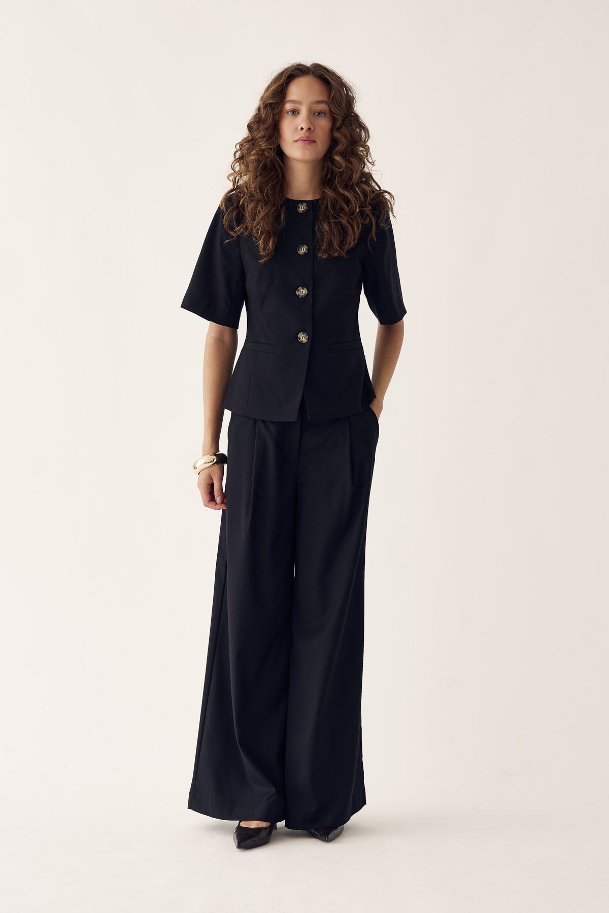 Kazia Pants hebben wijde pijpen, een middelhoge taille, plooien aan de voorkant en sierzakken aan de achterkant. Je kunt Kazia Pants gemakkelijk stylen voor dagelijks gebruik en feestelijke gelegenheden.