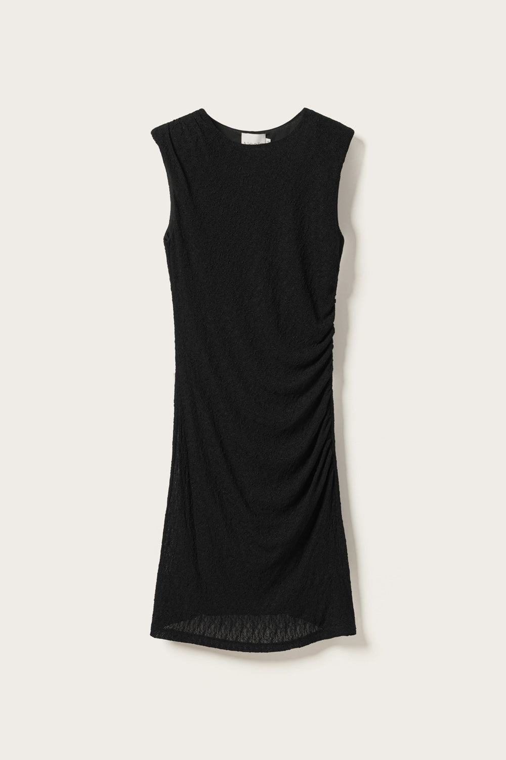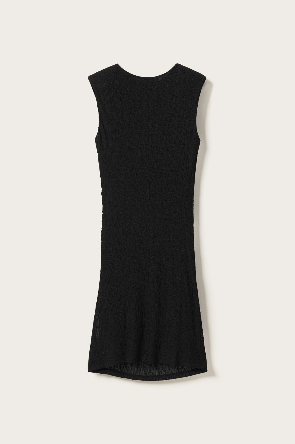 Lachina Dress is een korte, mouwloze jurk met plooien bij de zijnaden en schouders in fijne kant. De aansluitende pasvorm valt soepel bij de rok. Combineer met laarzen voor een stoere look of met hakken voor een vrouwelijke en klassieke stijl.
