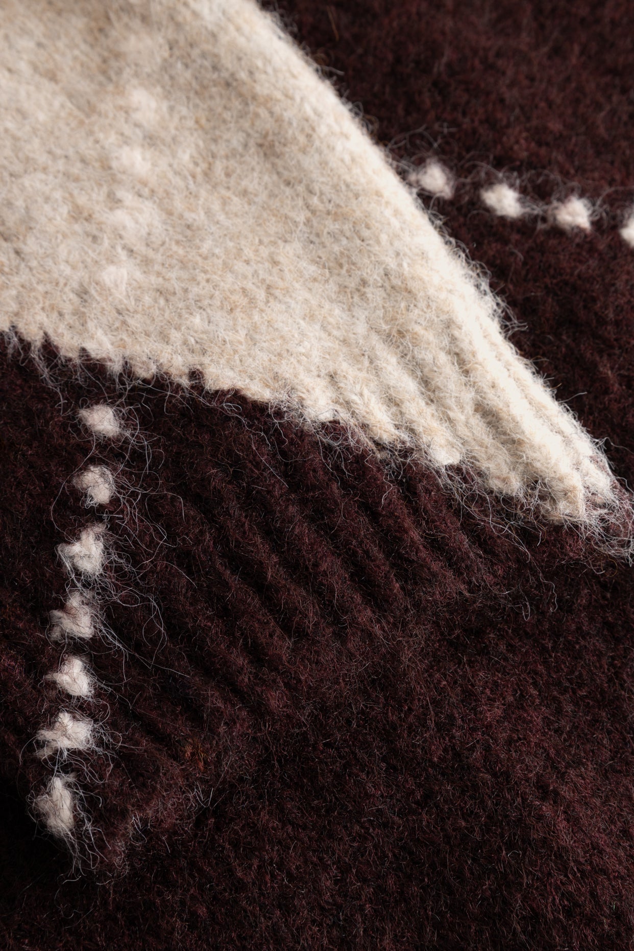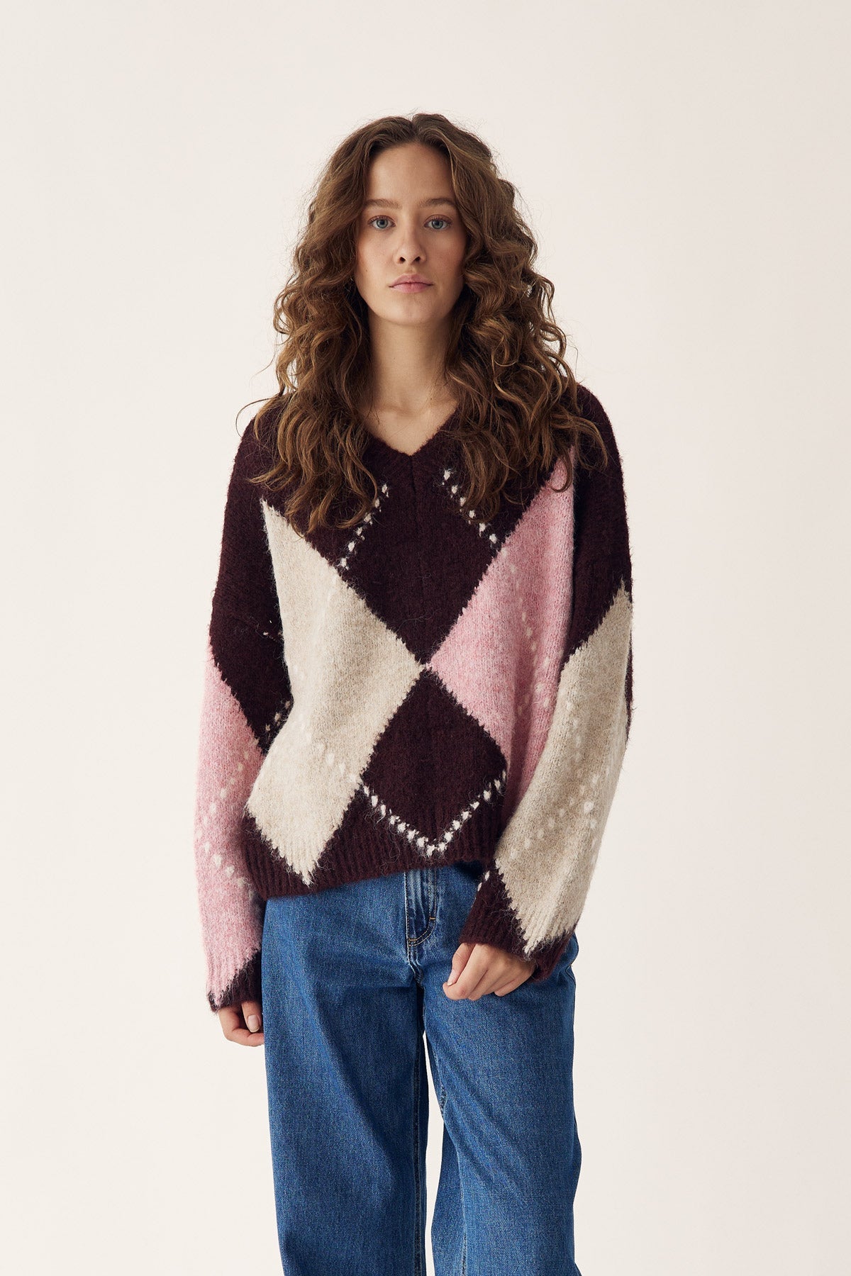 Lai Knit is een klassieke trui met een Argylepatroon. Ontworpen met een V-hals, lange volumineuze mouwen en een losse pasvorm voor een exclusieve en tijdloze uitstraling. Een statement piece in de garderobe, perfect te combineren met jeans, een nette broek of een rok.