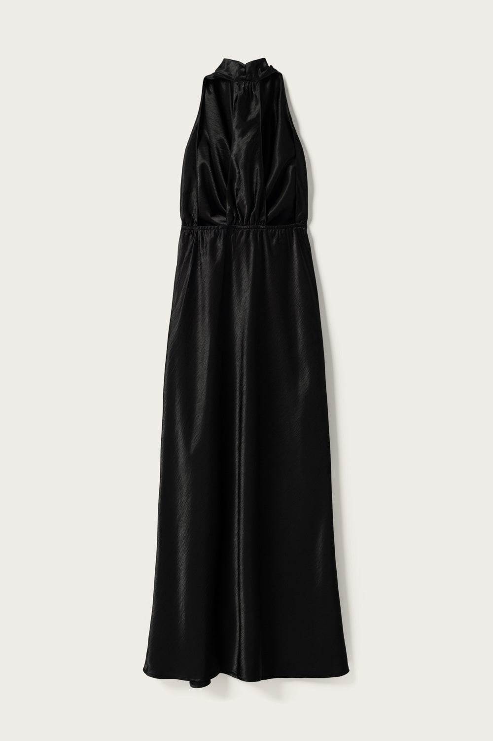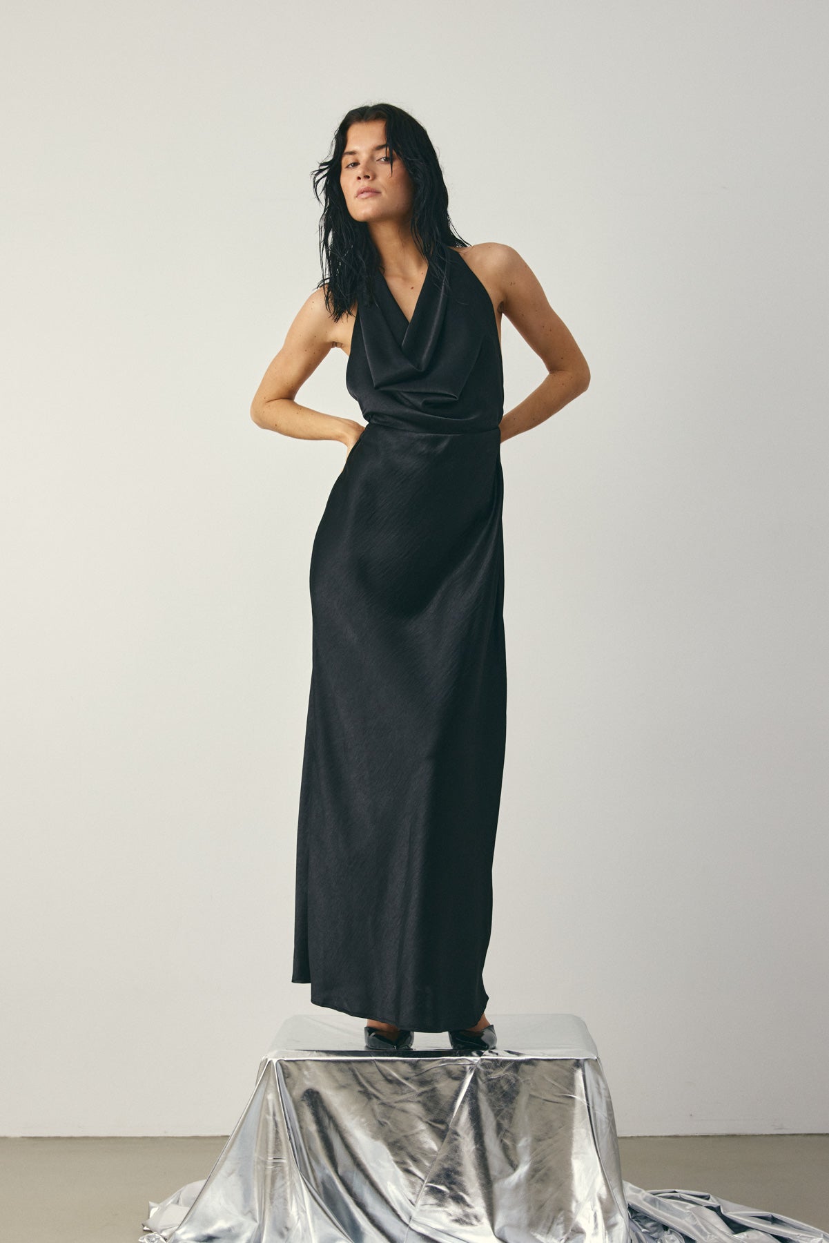 Lanika Dress is een prachtige lange satijnen jurk met elegante waterfall-plooien aan de voorkant. Perfect voor speciale gelegenheden, combineer met hakken en een stijlvolle tas voor een verfijnde uitstraling.