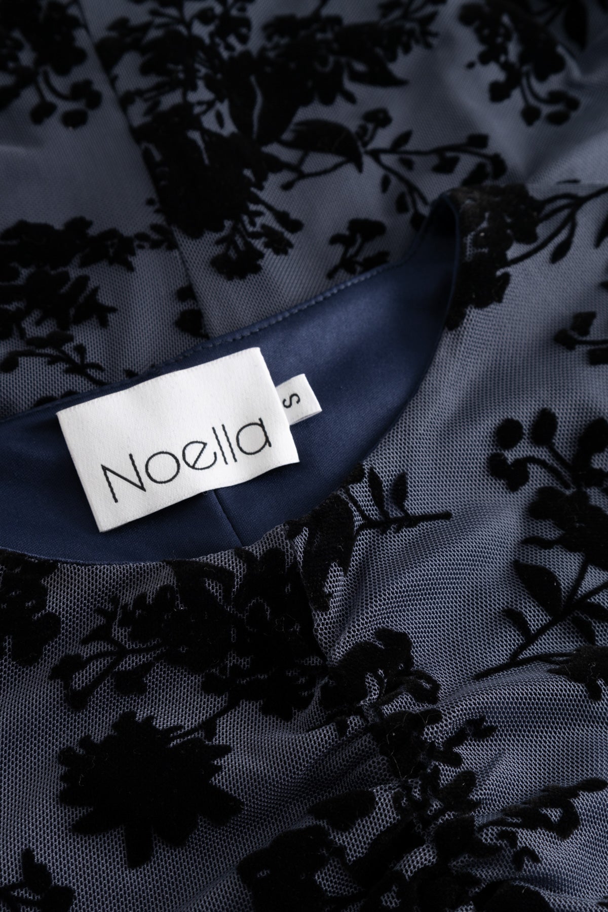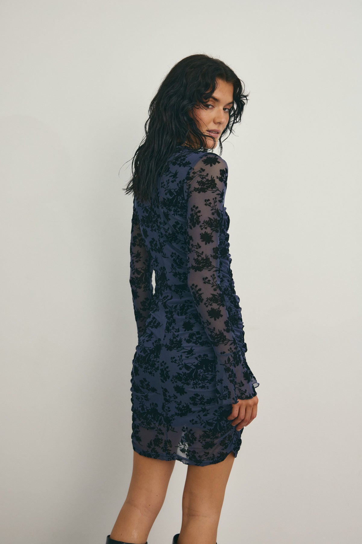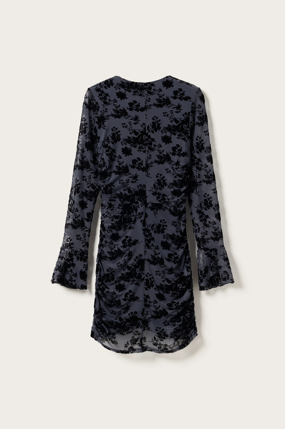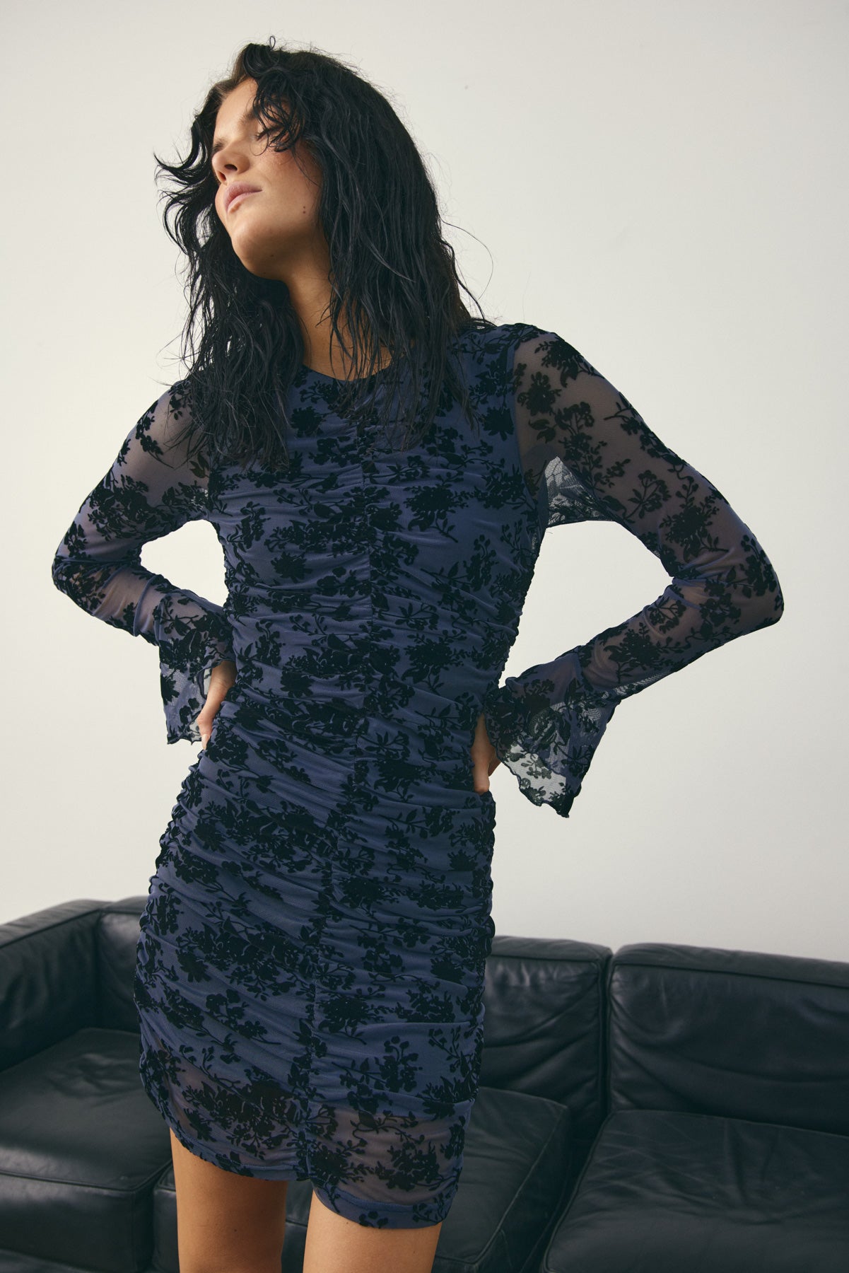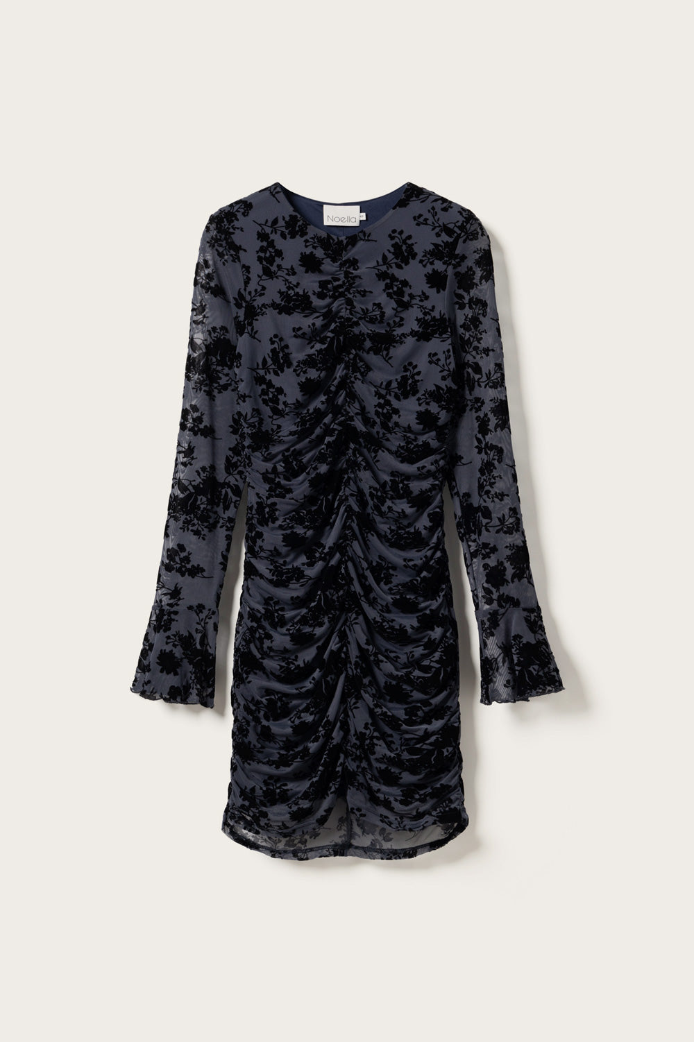 Lavetta Dress is een getailleerde jurk met plooidetails langs het lichaam, brede manchetten en een geïntegreerde bloemenprint in de stof.