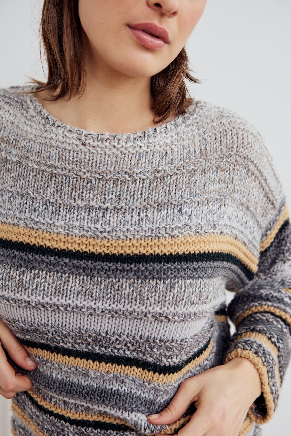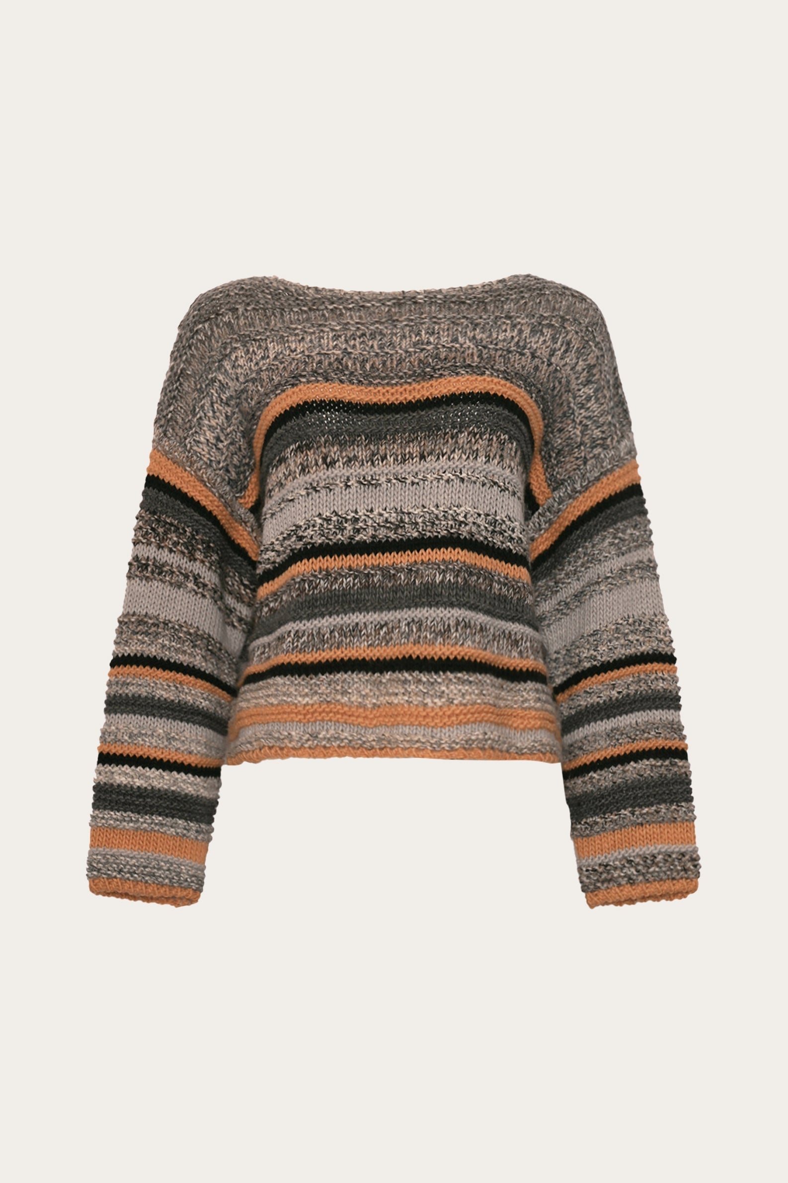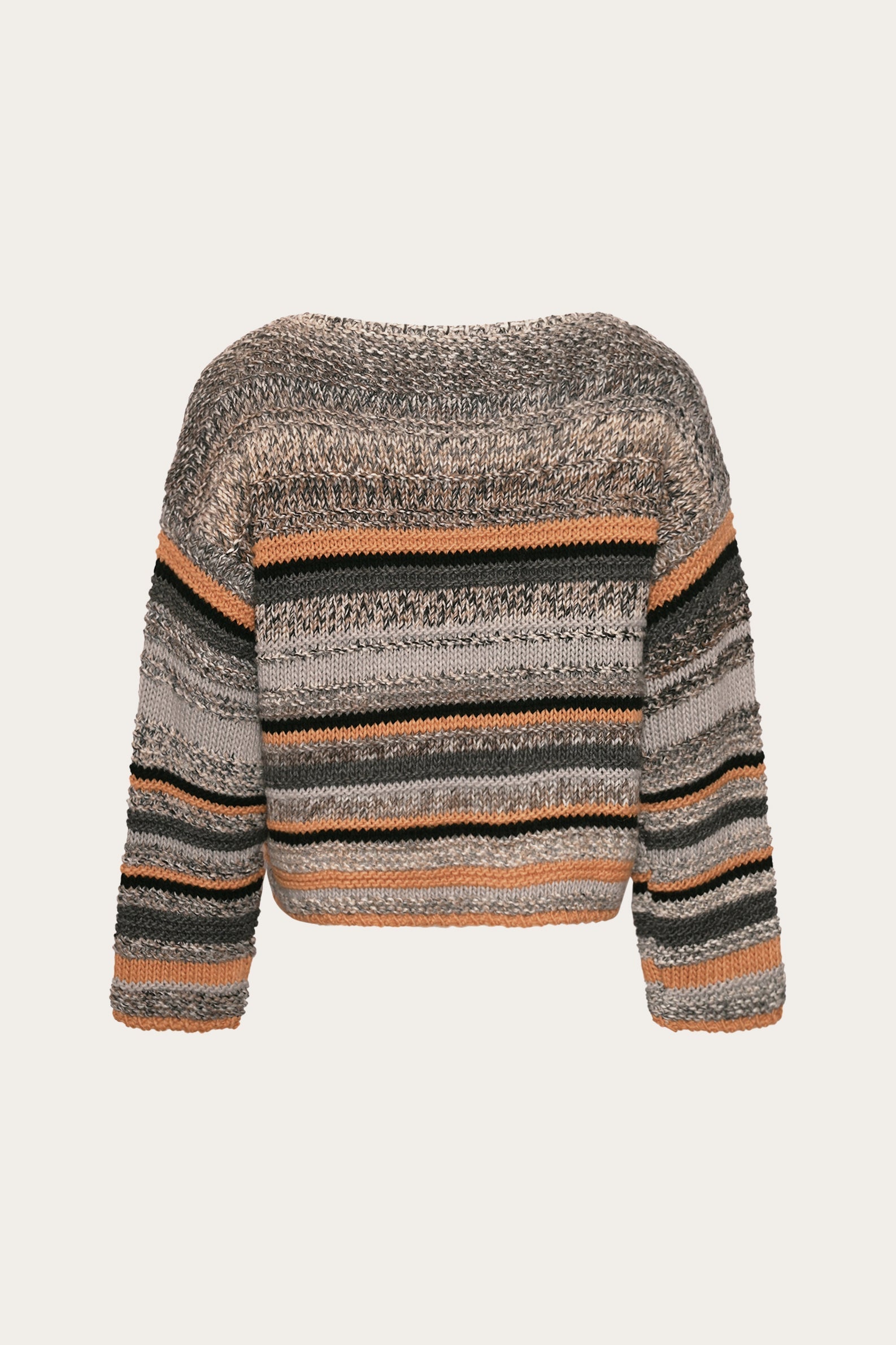 Leah Knit is een gebreide trui met een patroon in bijpassende kleurtonen en bevat 30 wol. Leah Knit heeft een brede halslijn en een losse pasvorm.