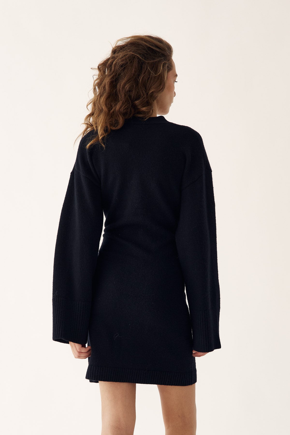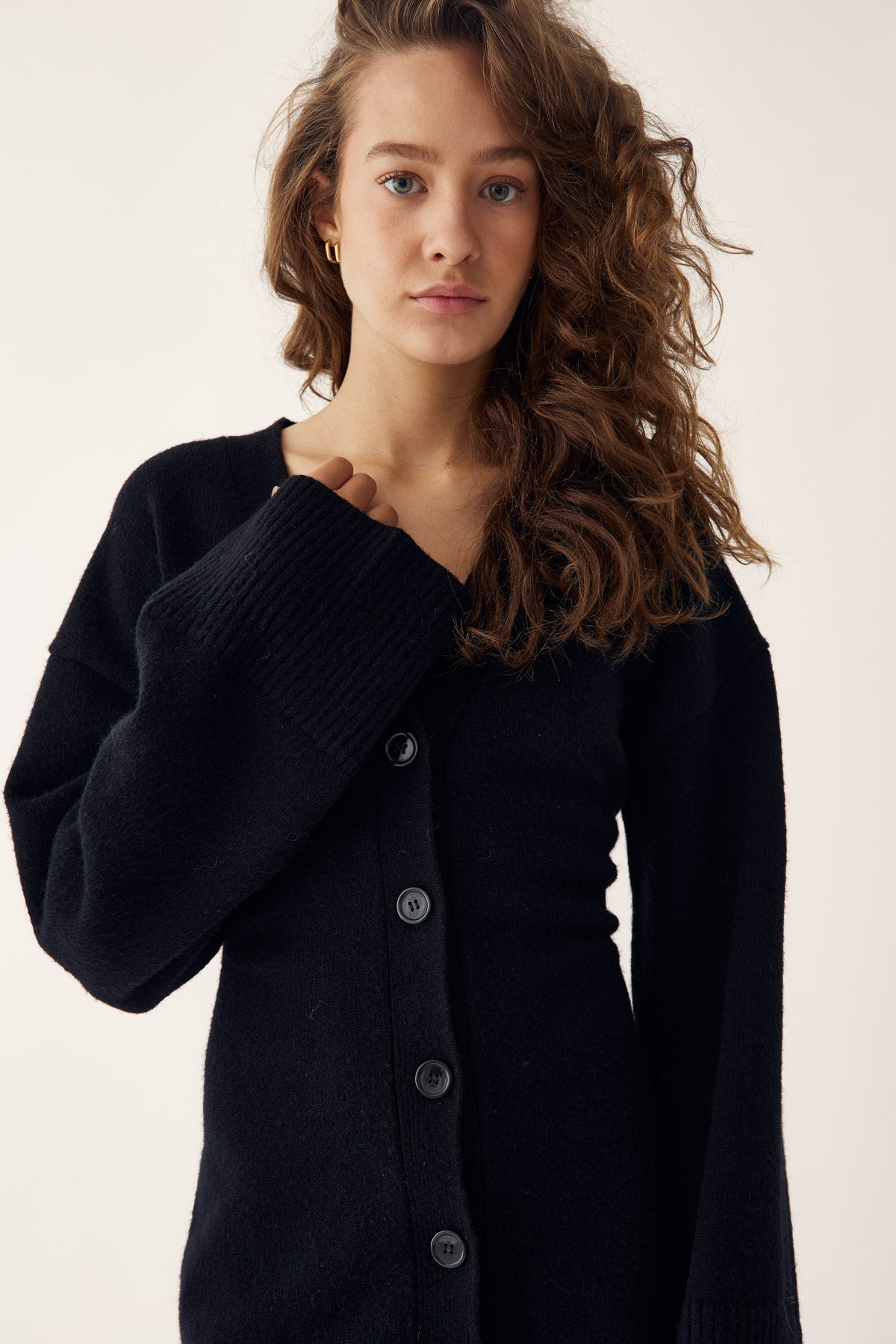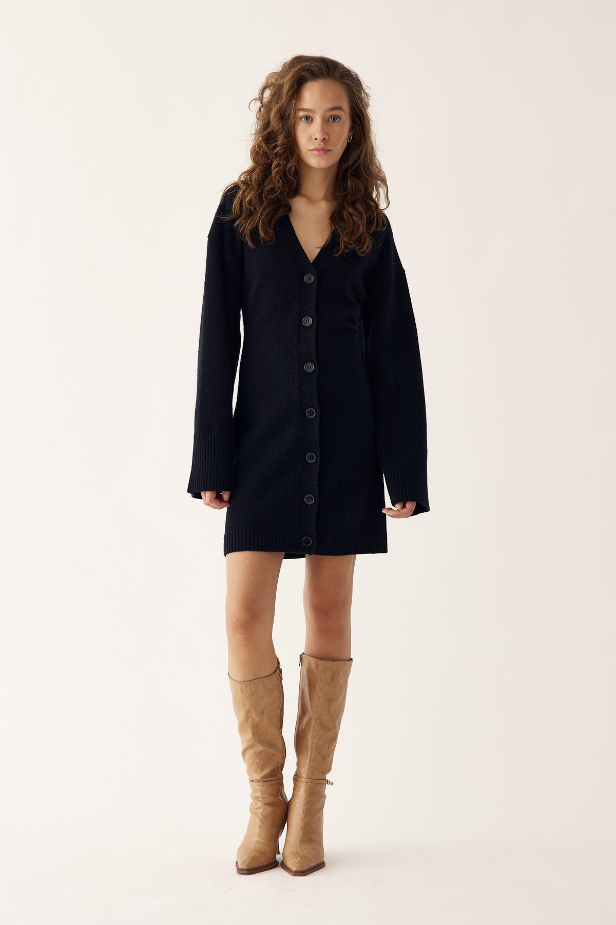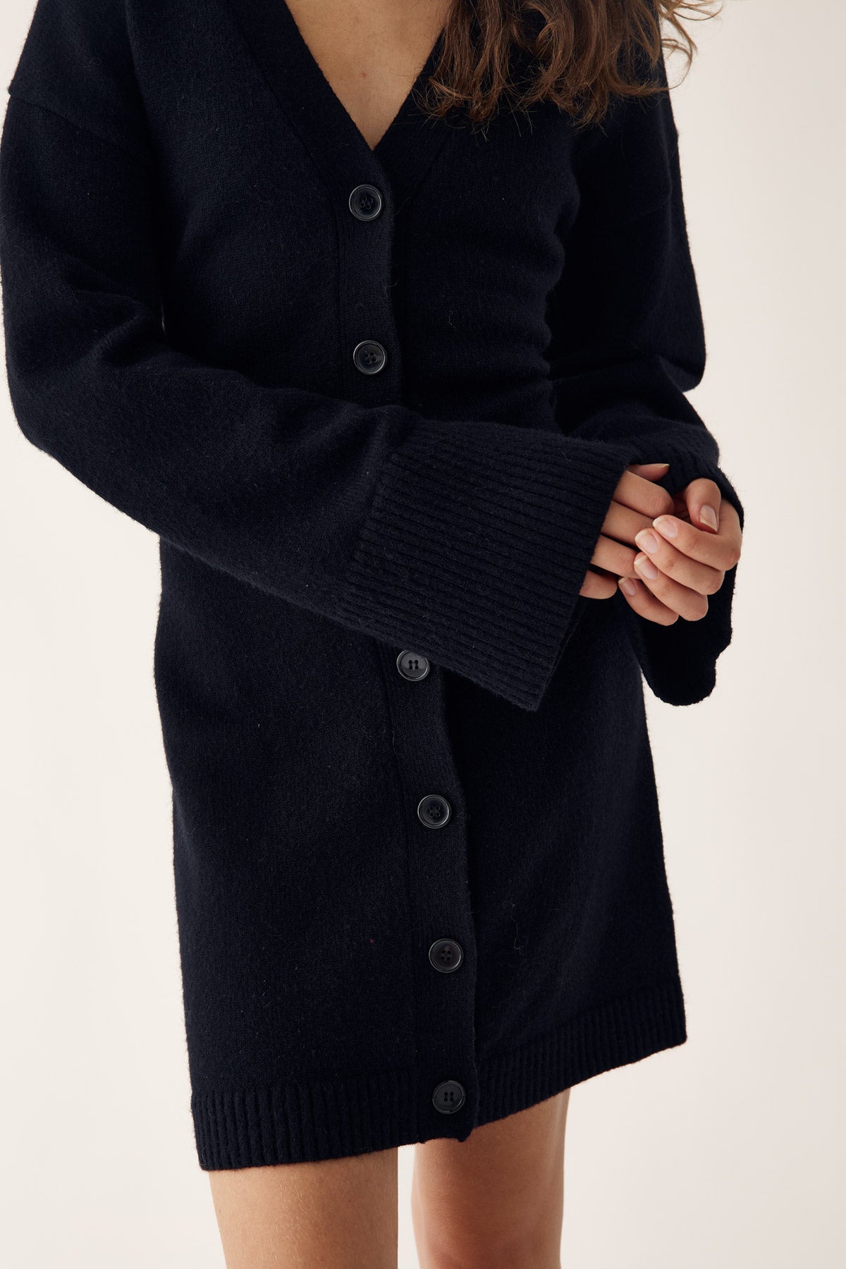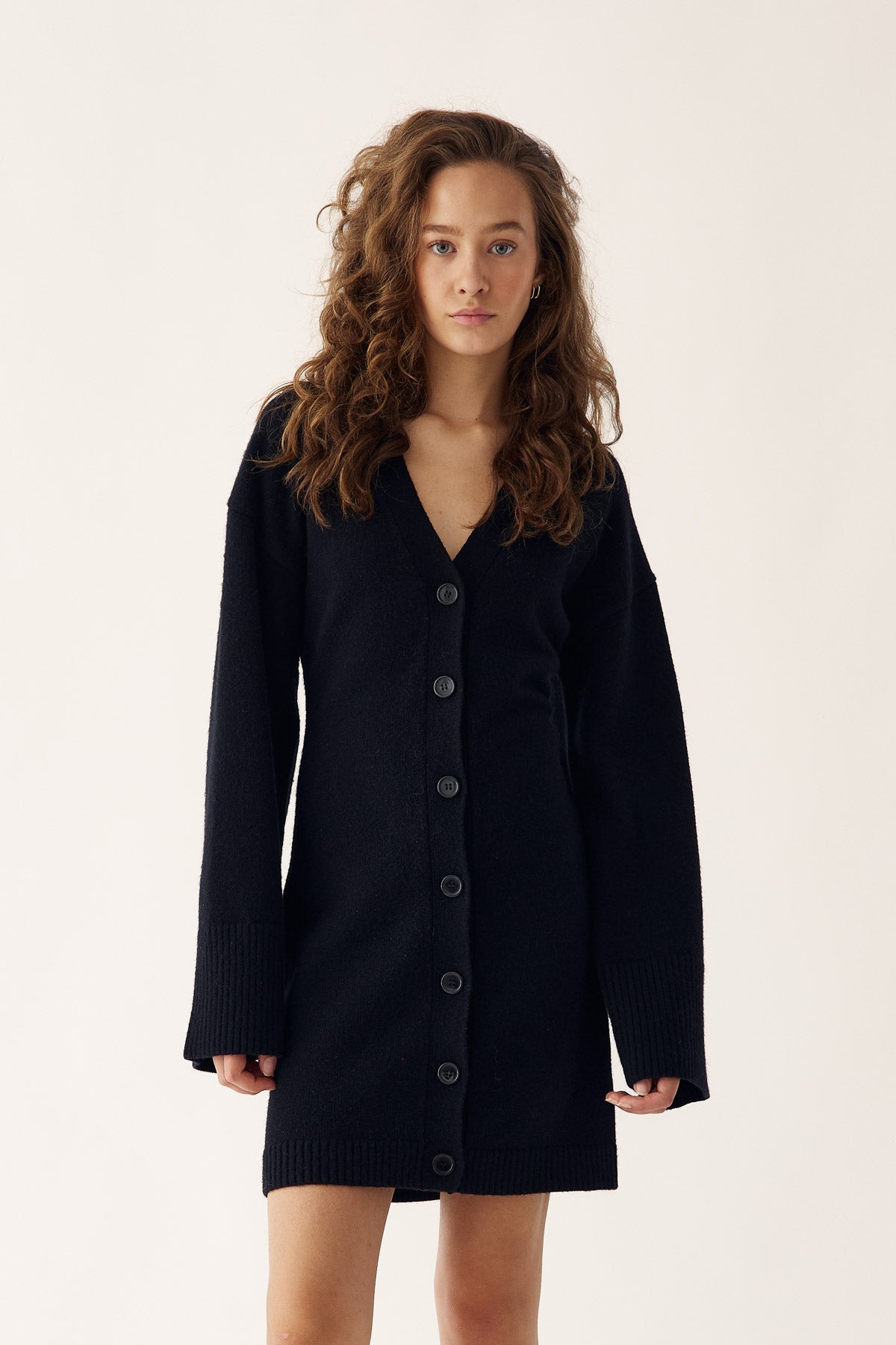 Lenyxanna Knit Dress is een cardiganjurk met een aangesloten pasvorm, lange volumineuze mouwen en knoopsluiting aan de voorkant.