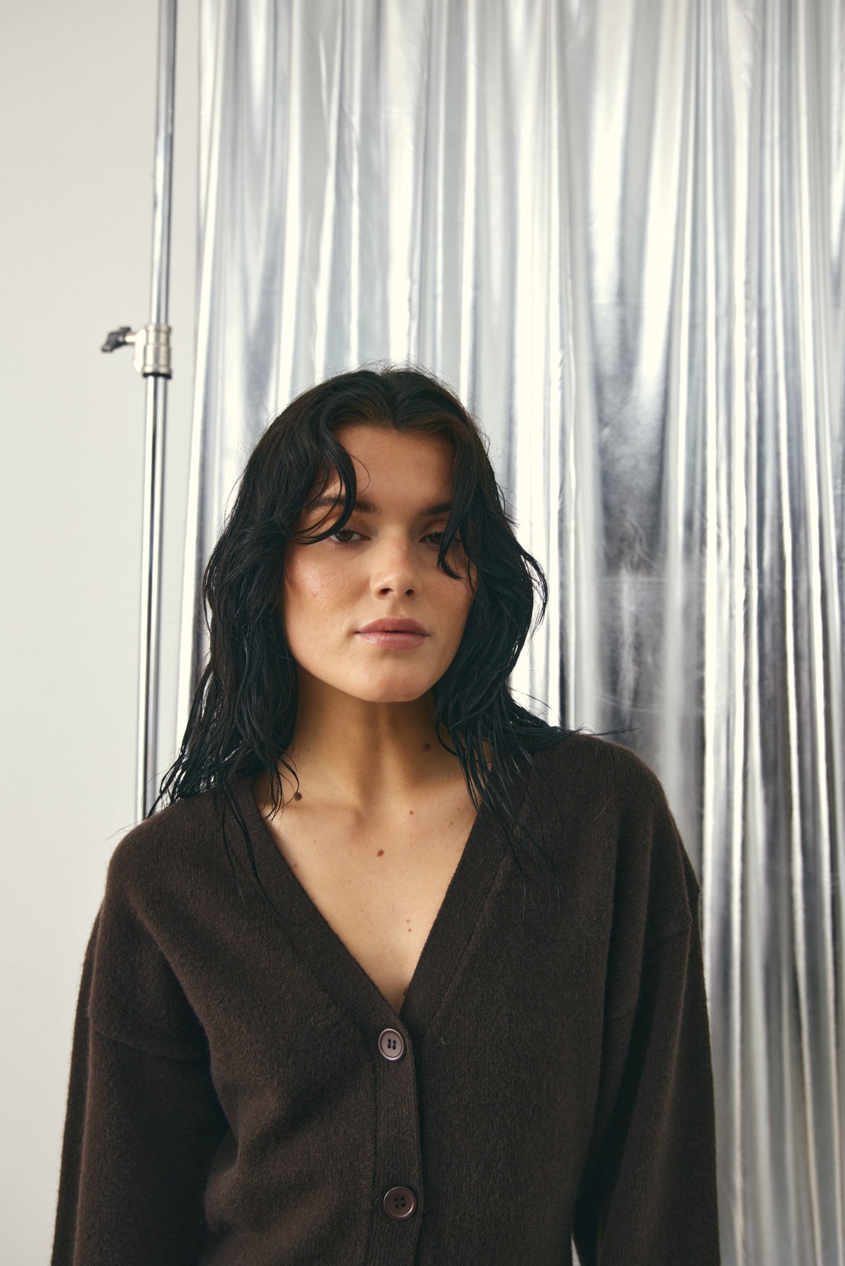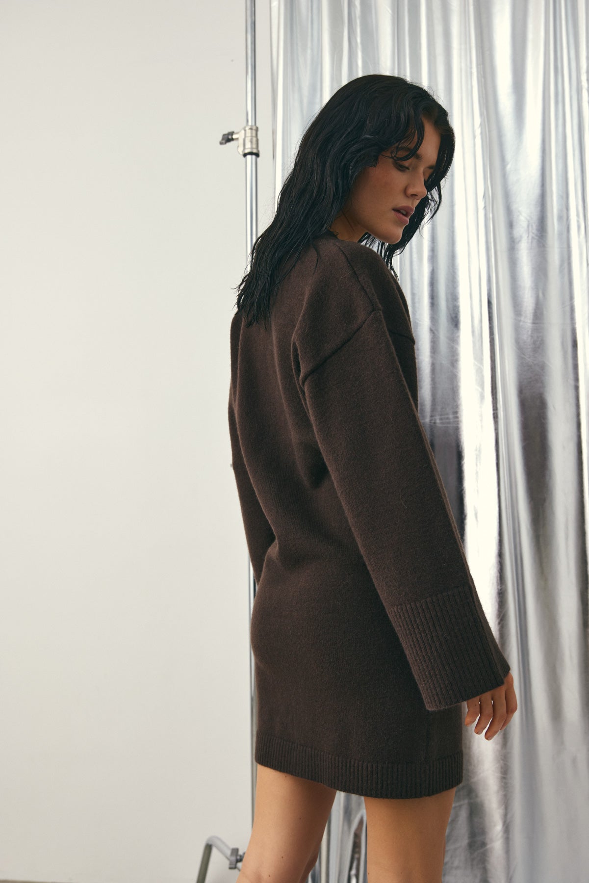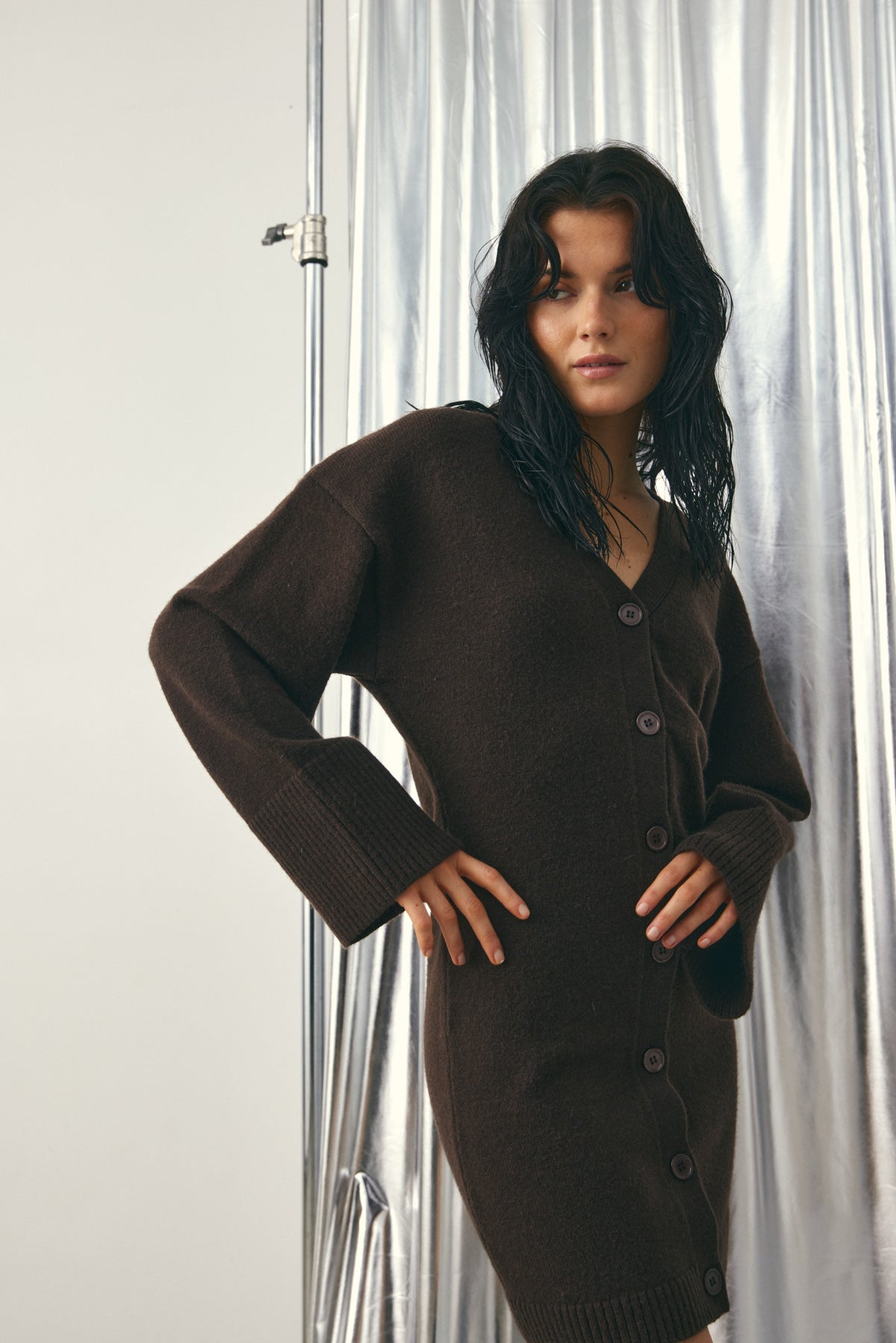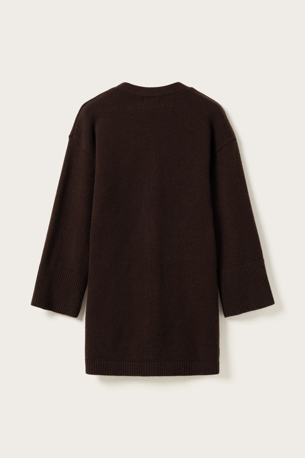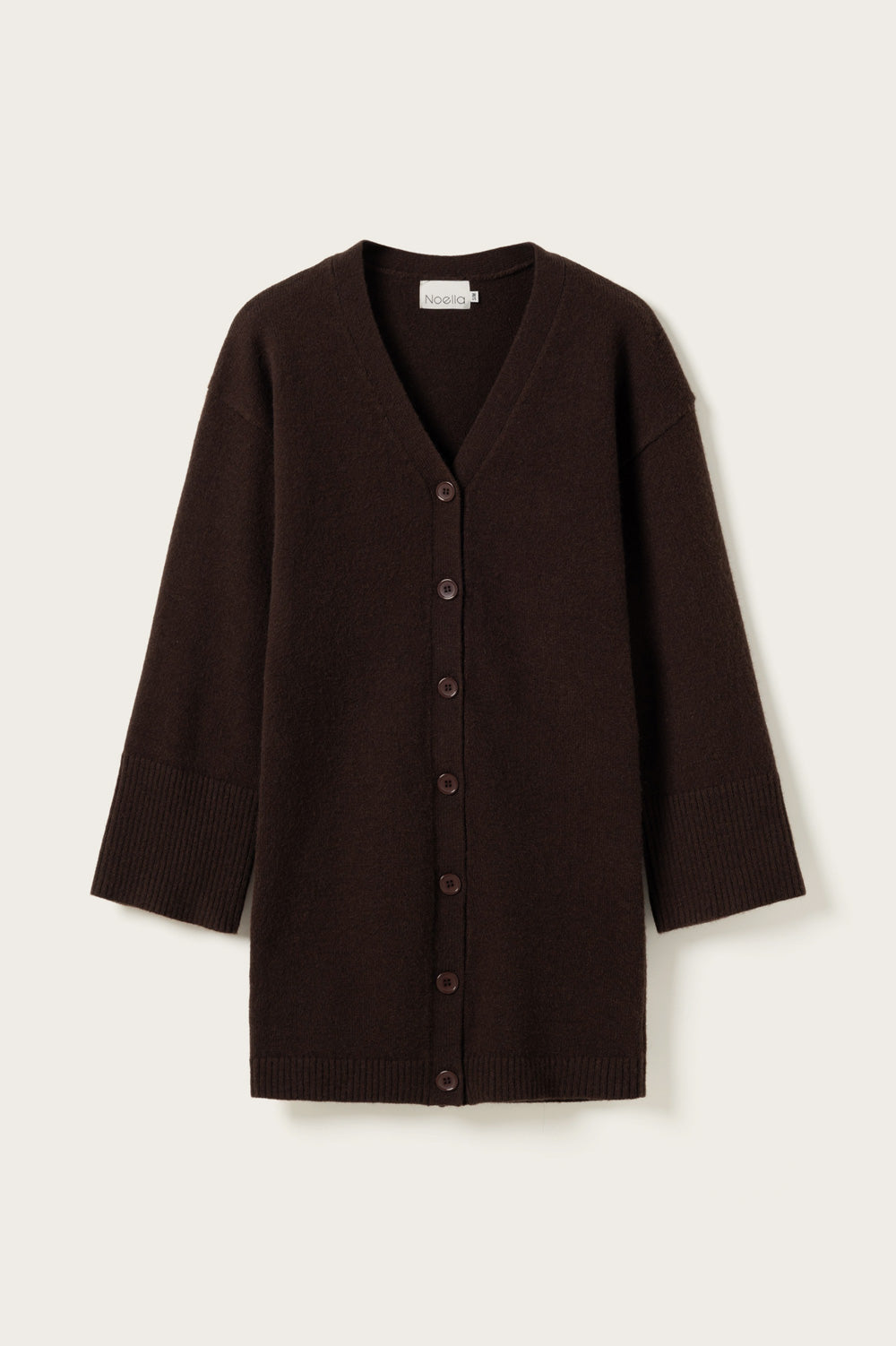 Lenyxanna Knit Dress is een cardiganjurk met een aangesloten pasvorm, lange volumineuze mouwen en knoopsluiting aan de voorkant.