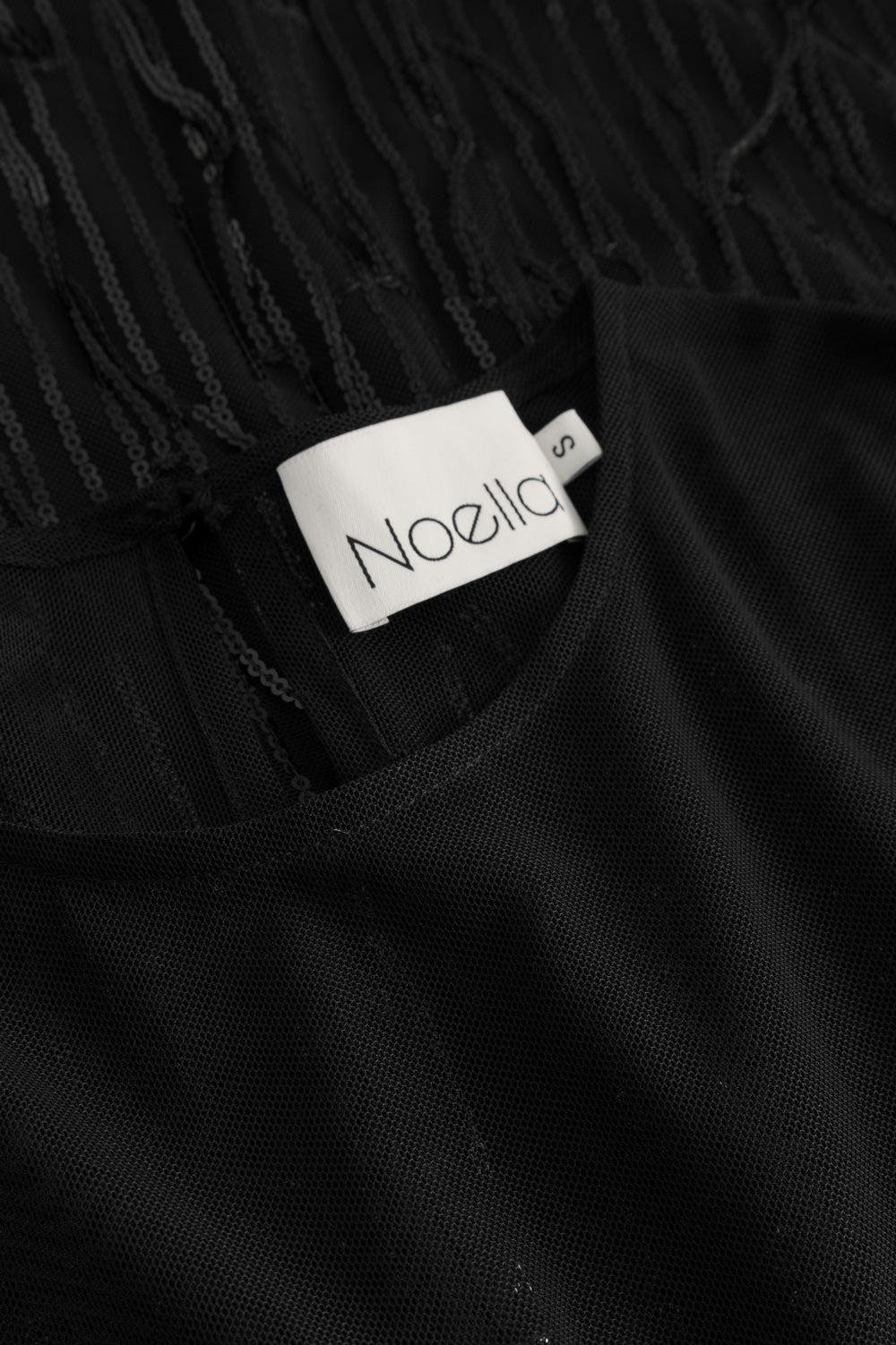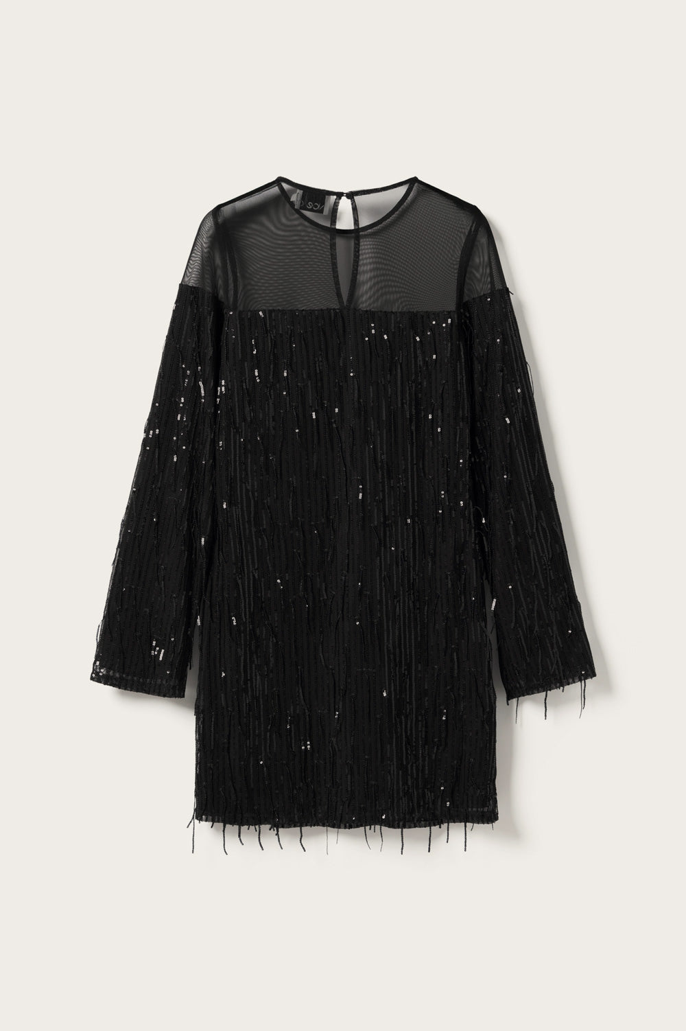 Leyah Dress is een korte jurk met glinsterende pailletten en een mesh-detail bij het bovenstuk. Perfect voor feestelijke gelegenheden en te combineren met hakken voor een elegante partylook of met laarzen voor een stoerdere stijl.