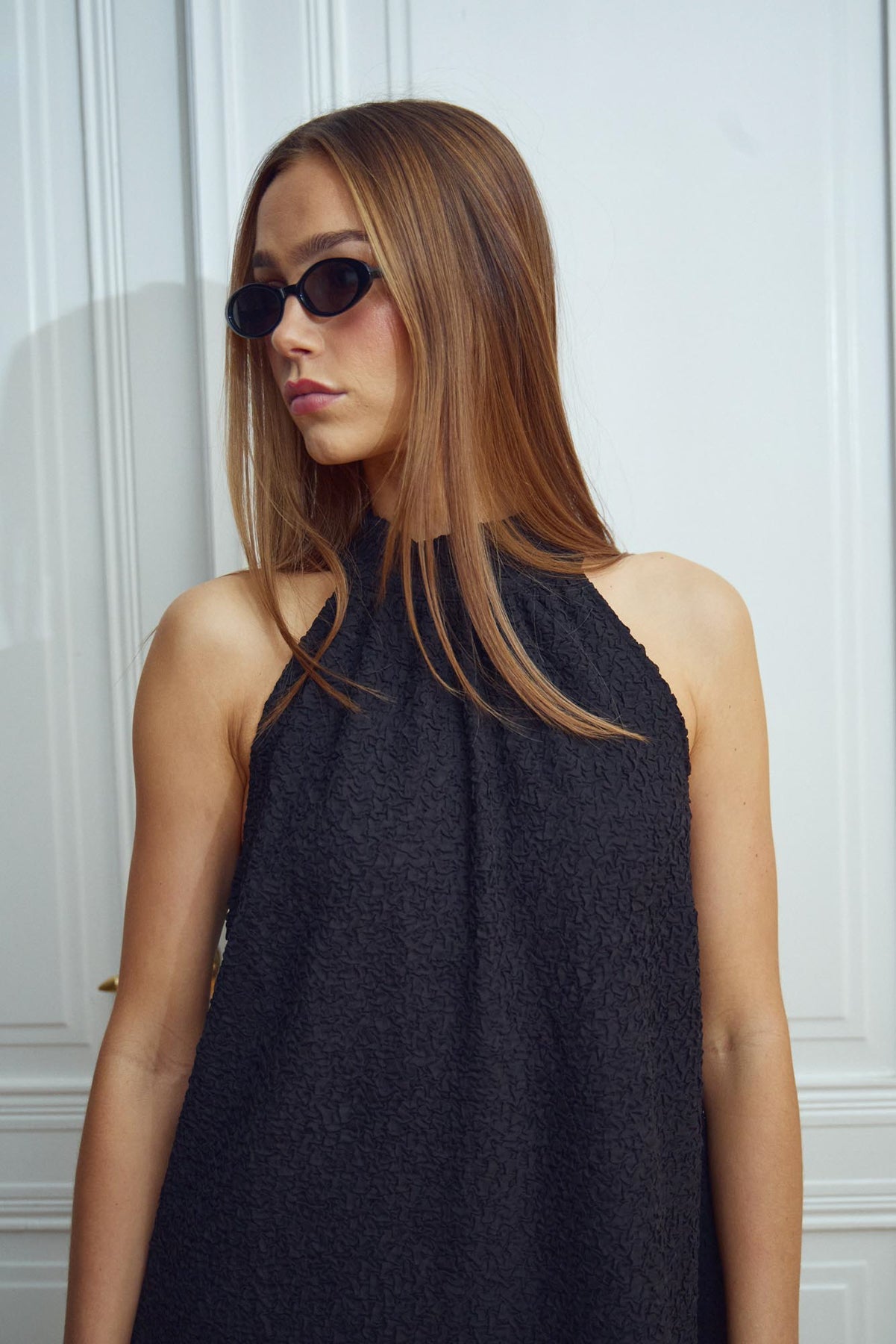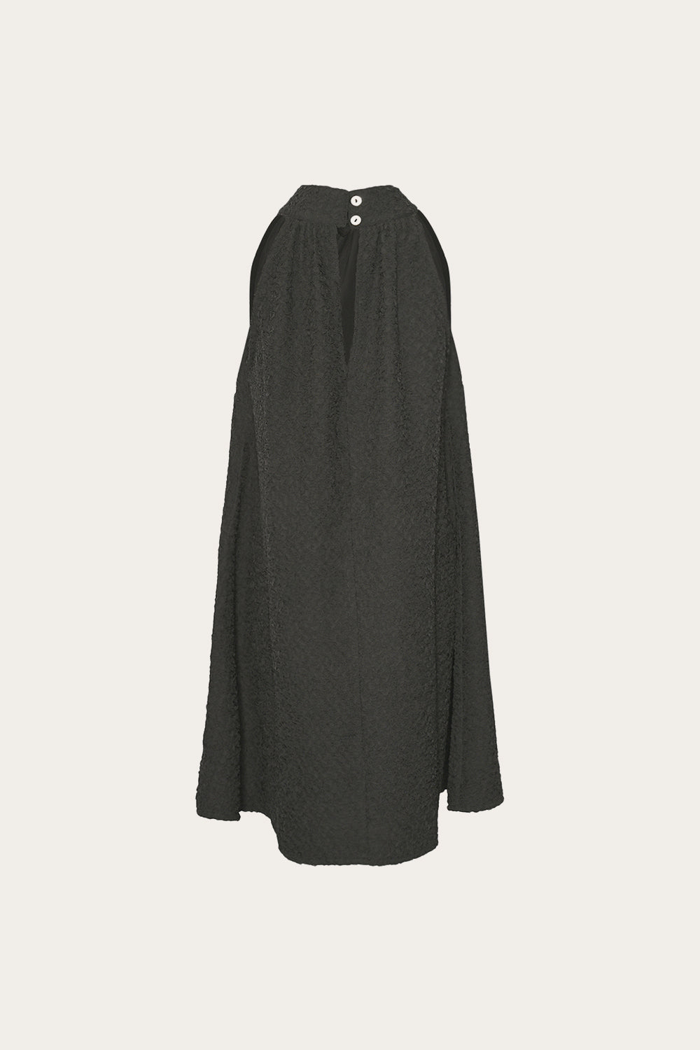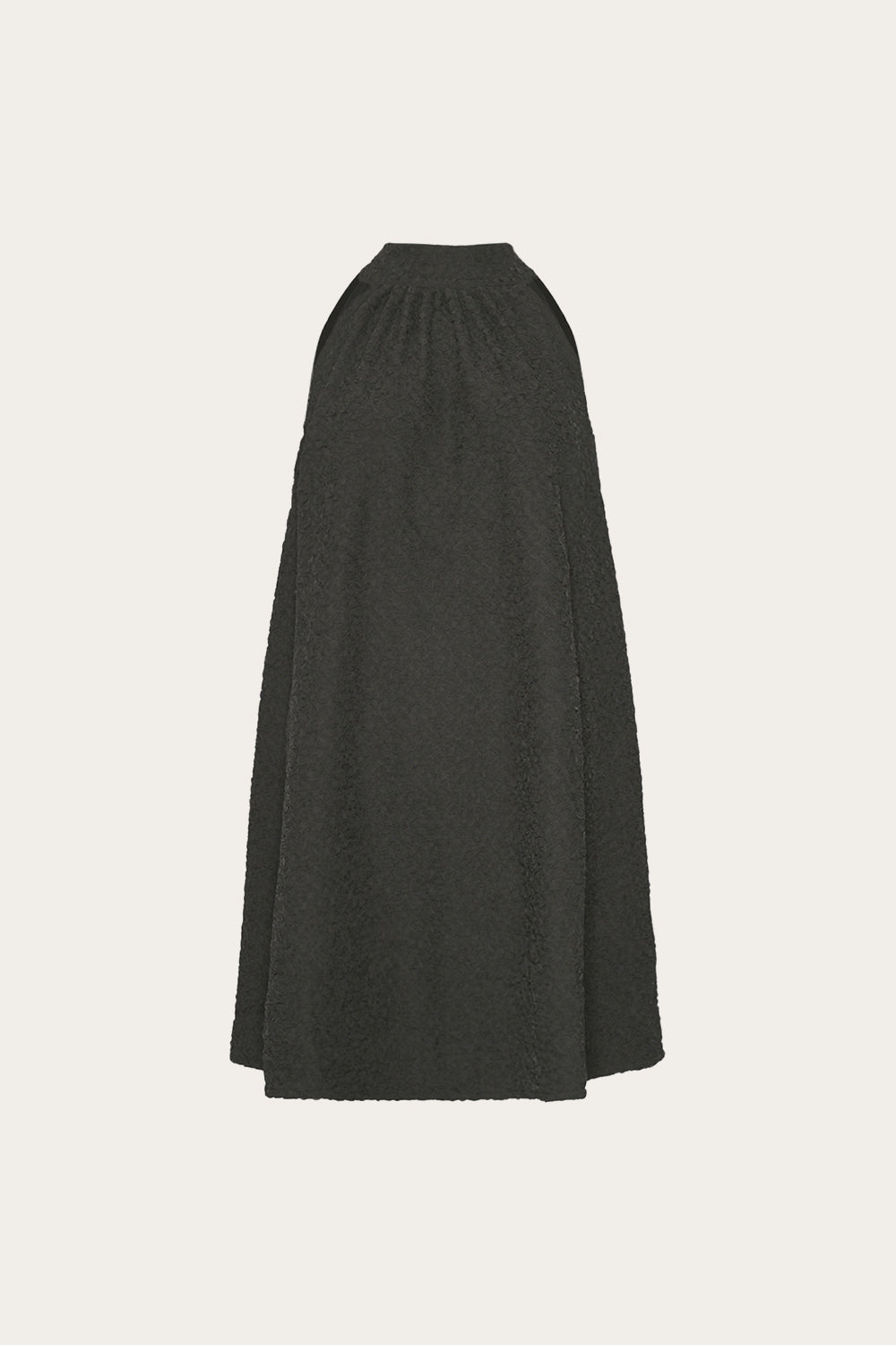 De Lora Dress is een halternekjurk met strikbandjes in de nek, wat zorgt voor een verstelbare pasvorm.
