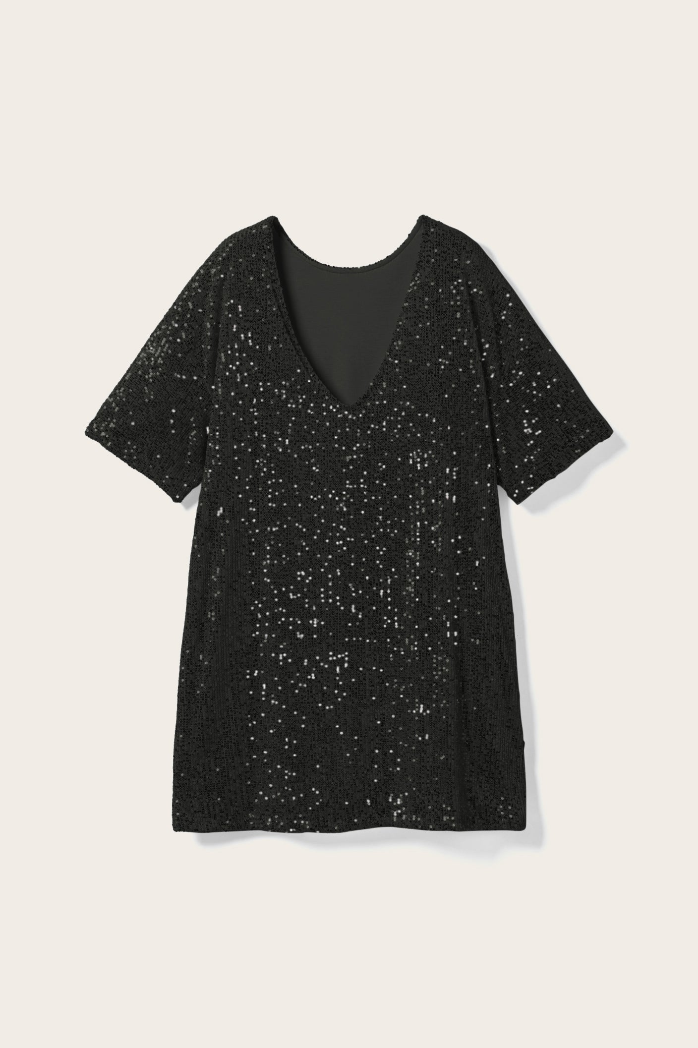 Lorah Dress is een jurk in T-shirtdesign met een losse pasvorm, korte mouwen, pailletten en een V-hals aan de achterkant.