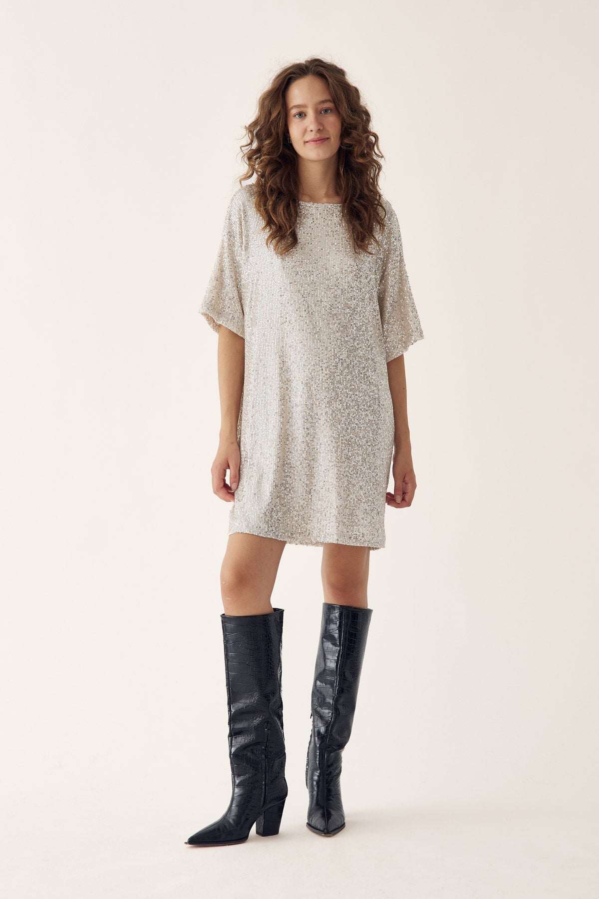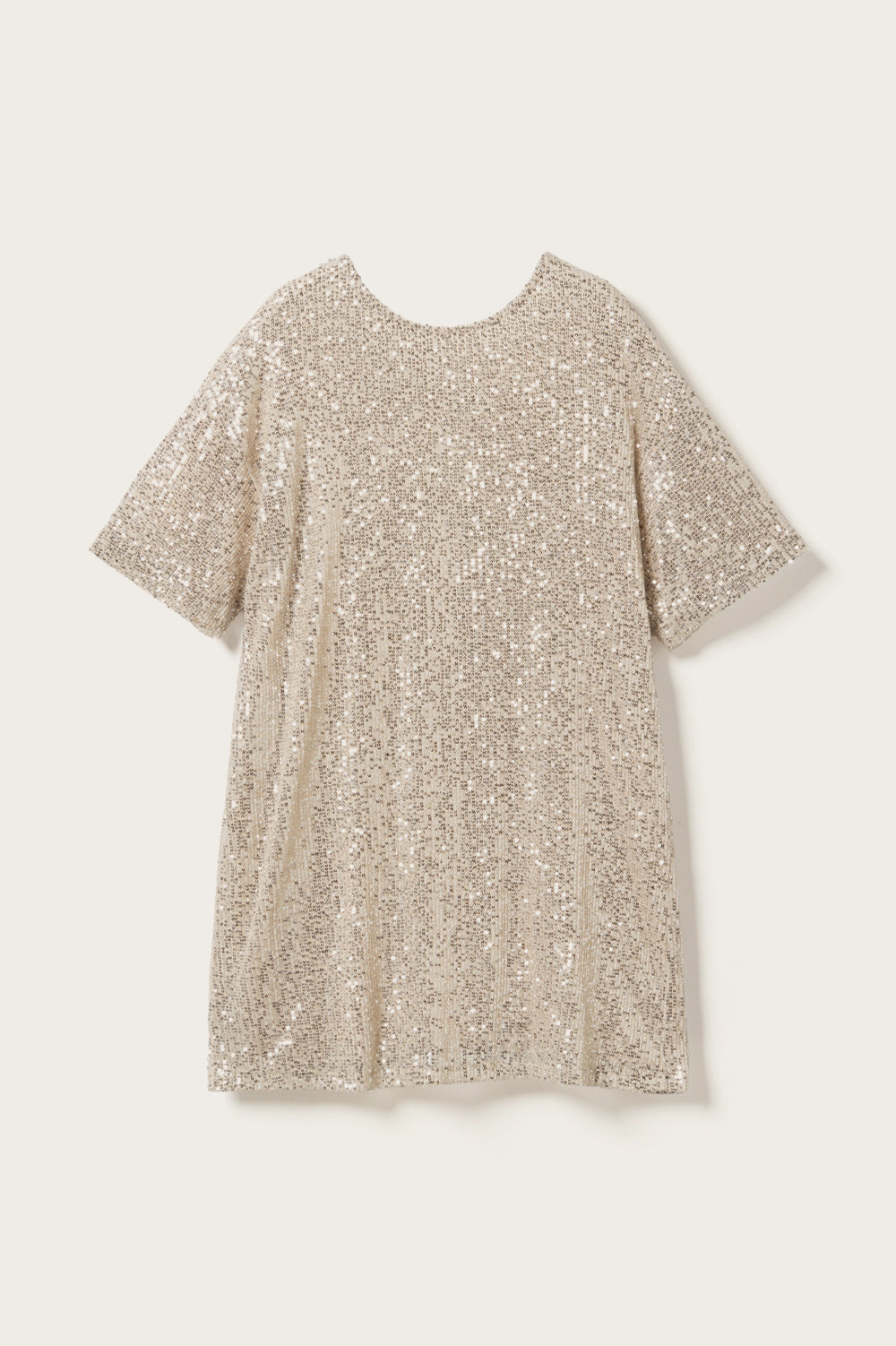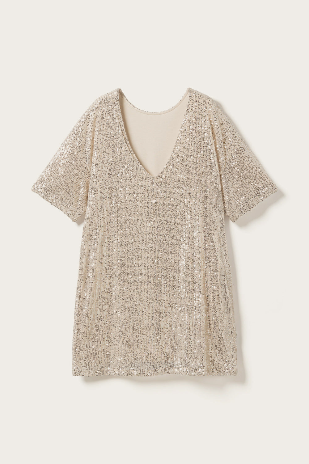 Lorah Dress is een jurk in T-shirtdesign met een losse pasvorm, korte mouwen, pailletten en een V-hals aan de achterkant.