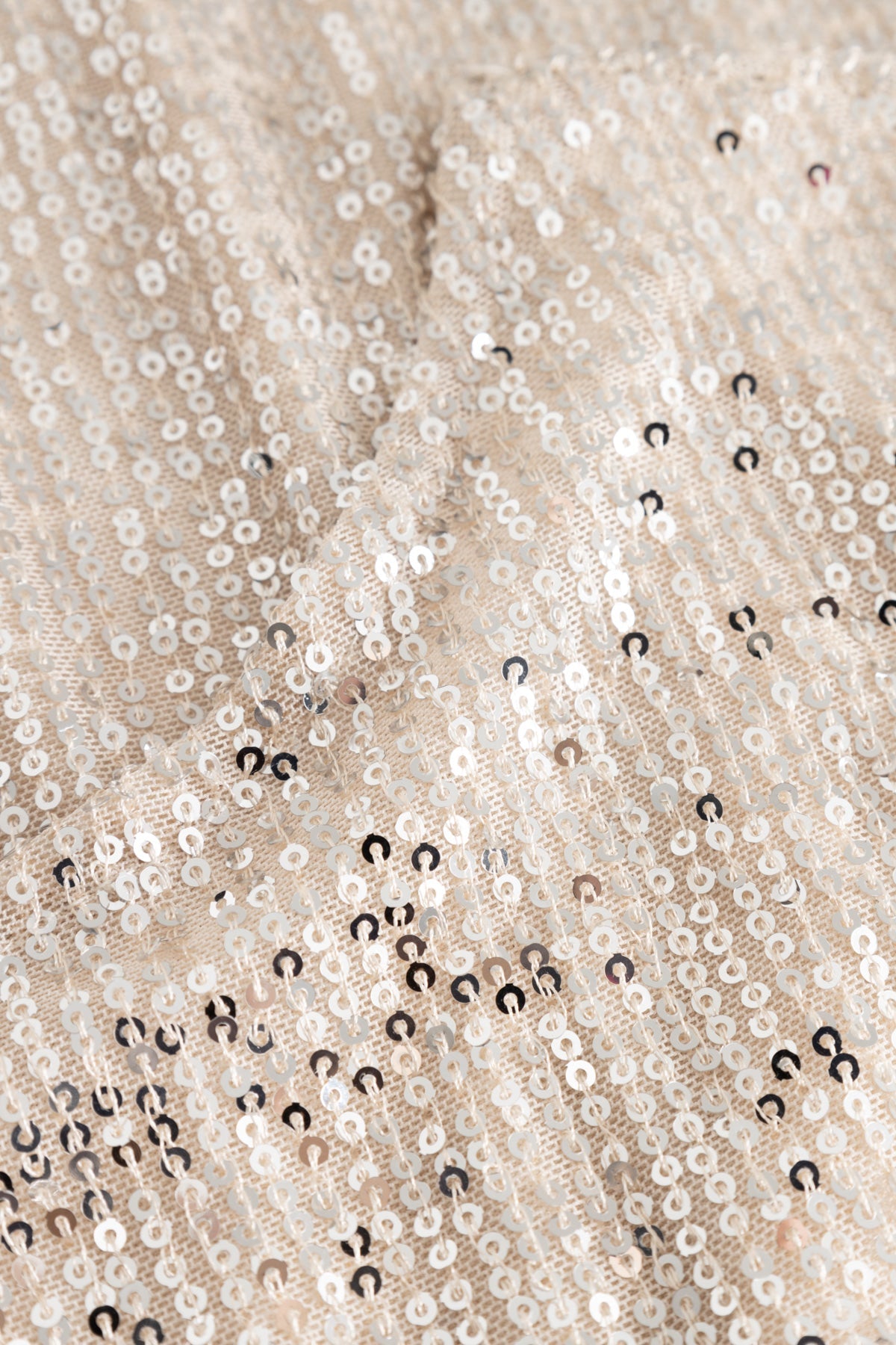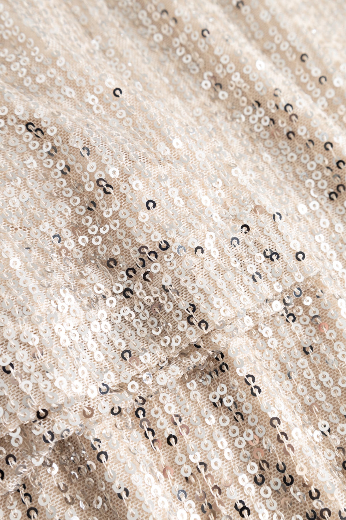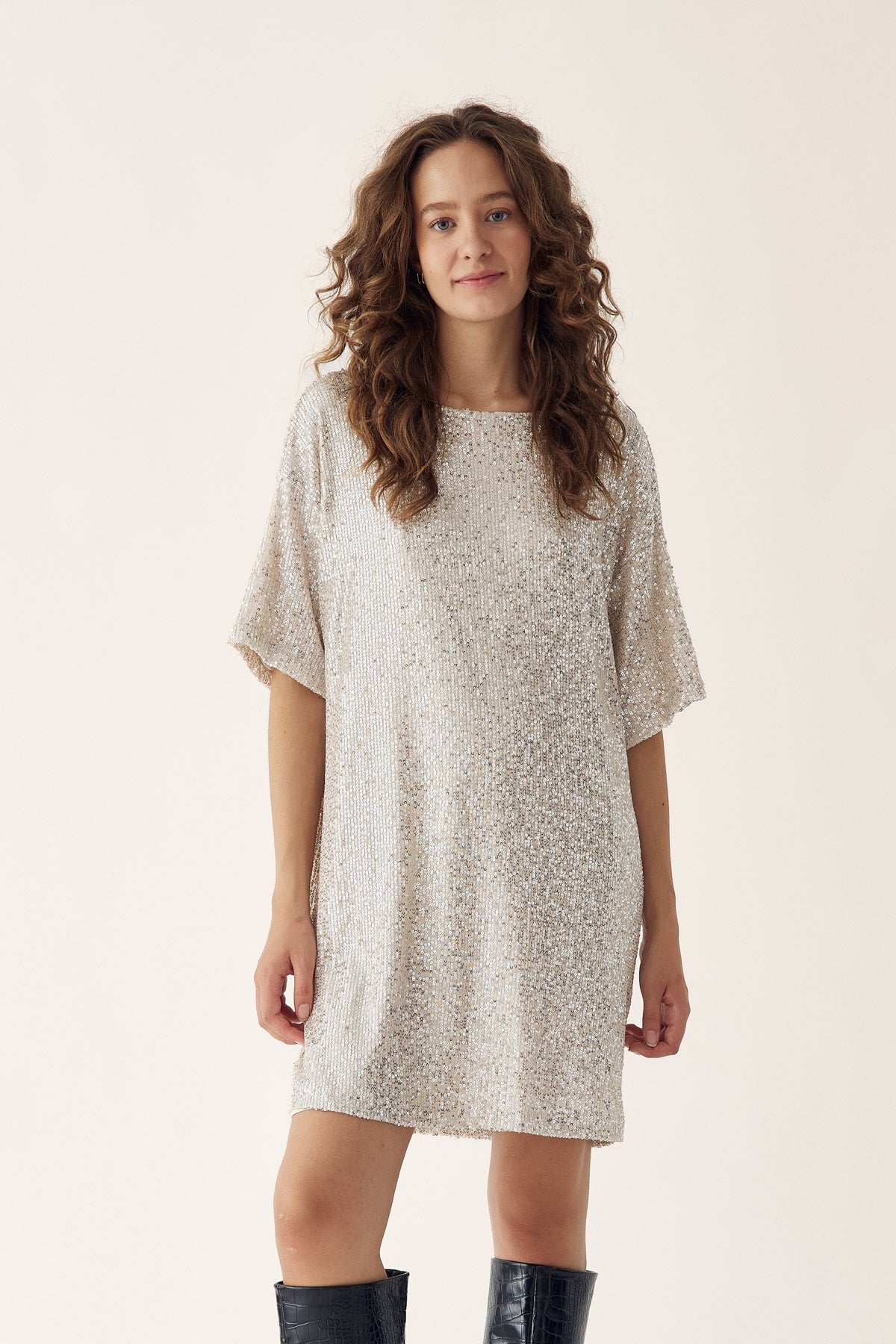 Lorah Dress is een jurk in T-shirtdesign met een losse pasvorm, korte mouwen, pailletten en een V-hals aan de achterkant.