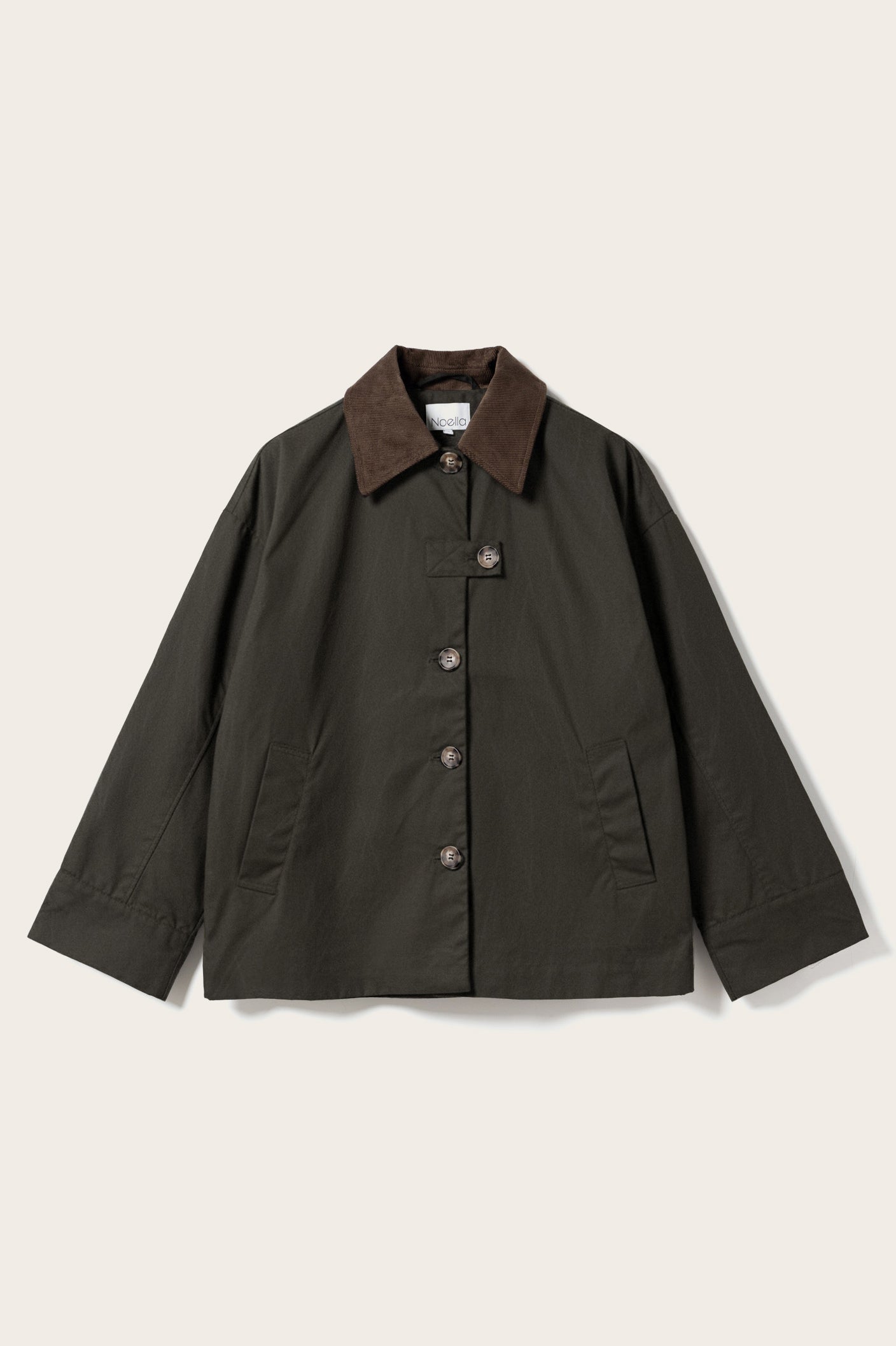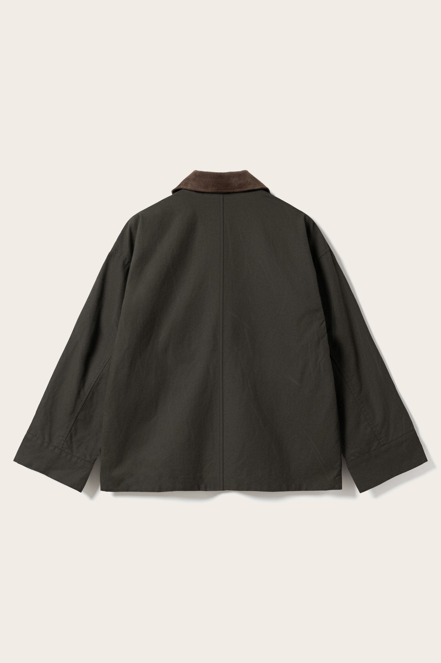 Dit jack geeft een moderne draai aan het klassieke workwear-silhouet. Het is gemaakt van duurzaam, gewaxt katoen met een gestructureerde, boxy pasvorm, oversized mouwen en een volledige knoopsluiting aan de voorkant voor een strak en functioneel uiterlijk. De contrasterende corduroy kraag voegt een coole touch toe, terwijl de ruime zakken praktisch zijn en een stoer karakter geven. Perfect om te dragen in laagjes over grove breisels of basic kledingstukken – een echte favoriet voor het tussenseizoen.