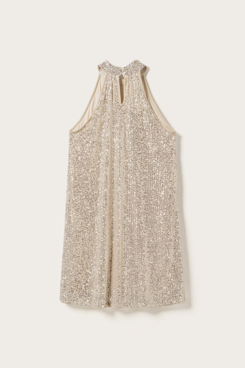 Luvena Dress is een korte jurk in A-lijnsilhouet met halterneck en pailletten. Perfect als partywear.