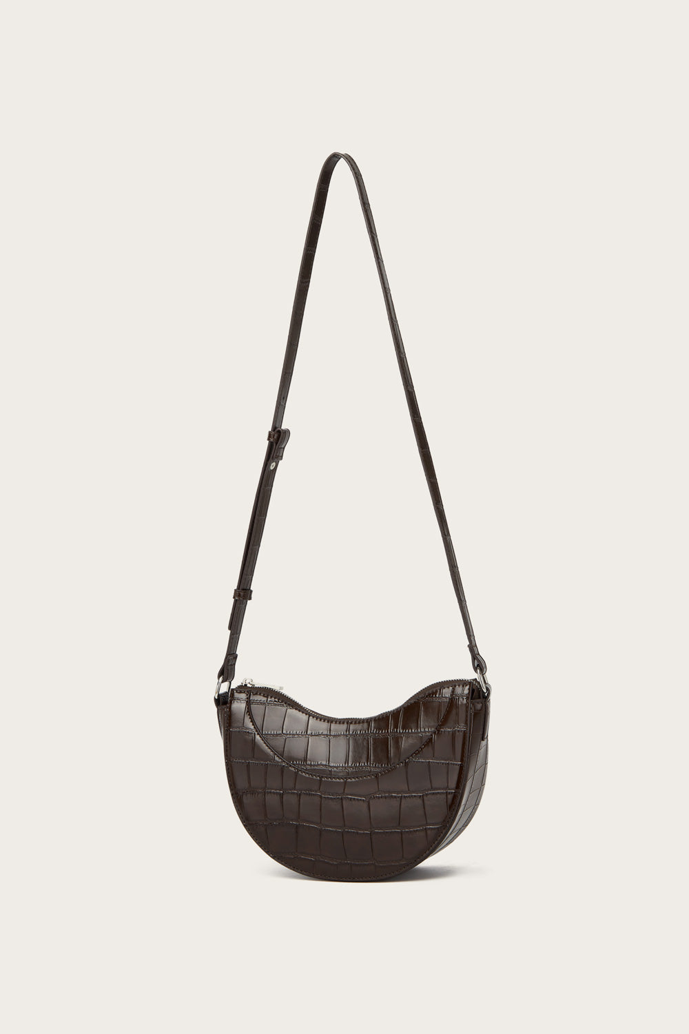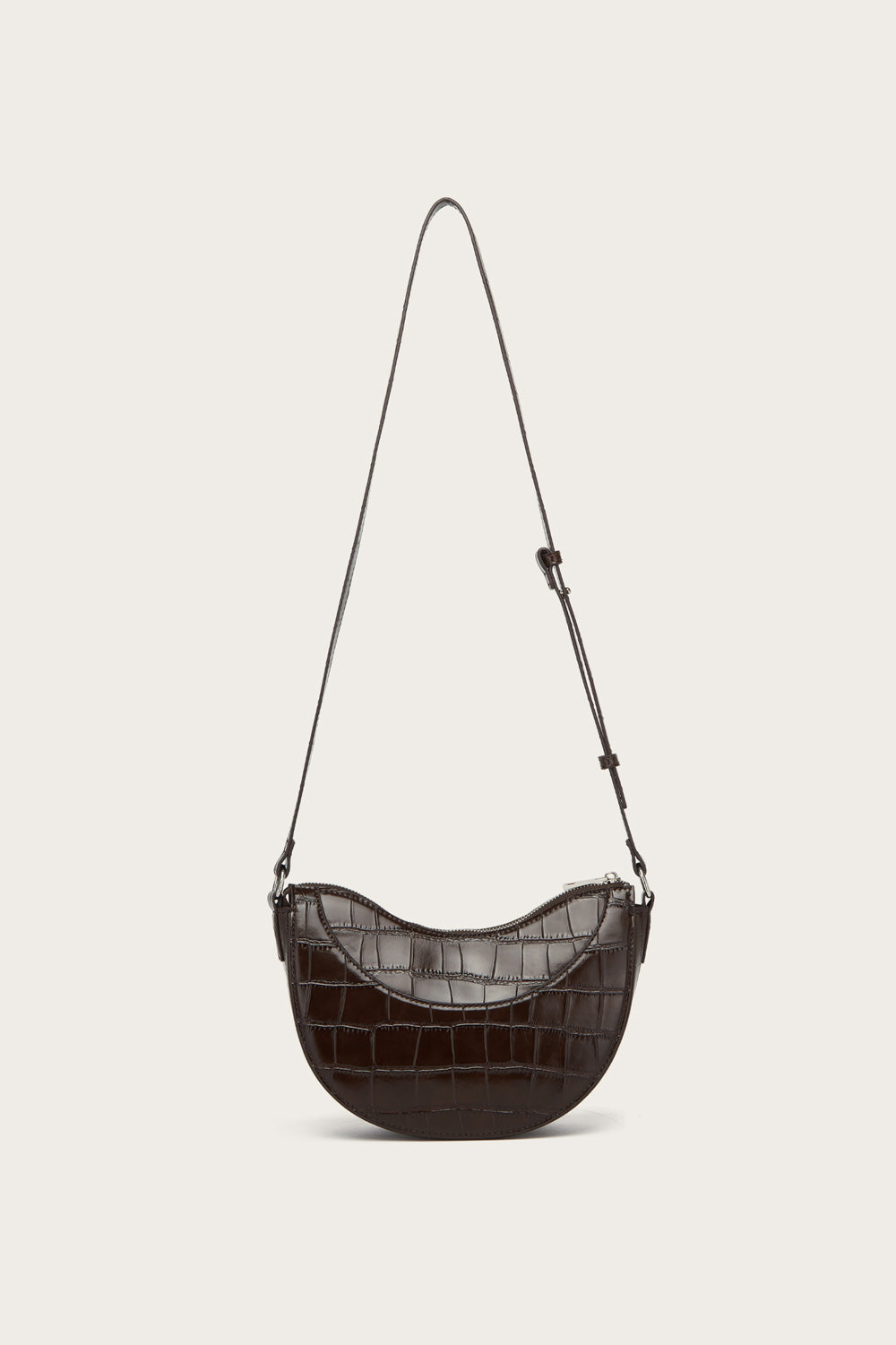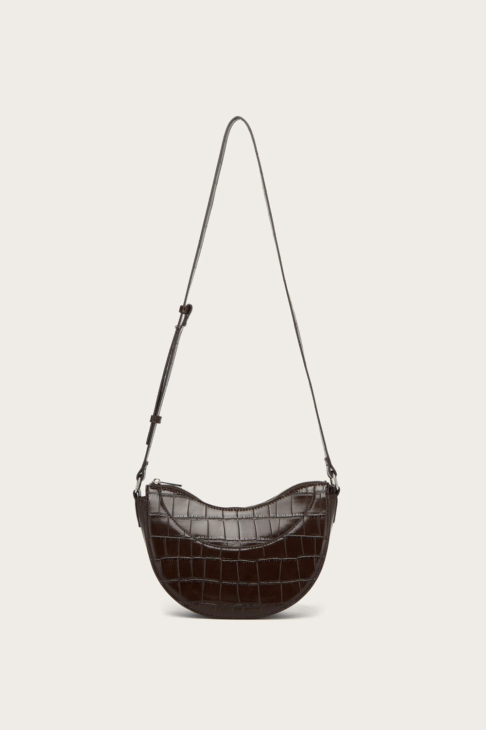A sleek crescent-shaped bag in PU with a croc-embossed finish that adds texture and edge. Designed with an adjustable shoulder strap, it can be worn crossbody or over the shoulder for versatile styling. The zip closure keeps your essentials secure, while the compact size makes it perfect for day-to-night wear.