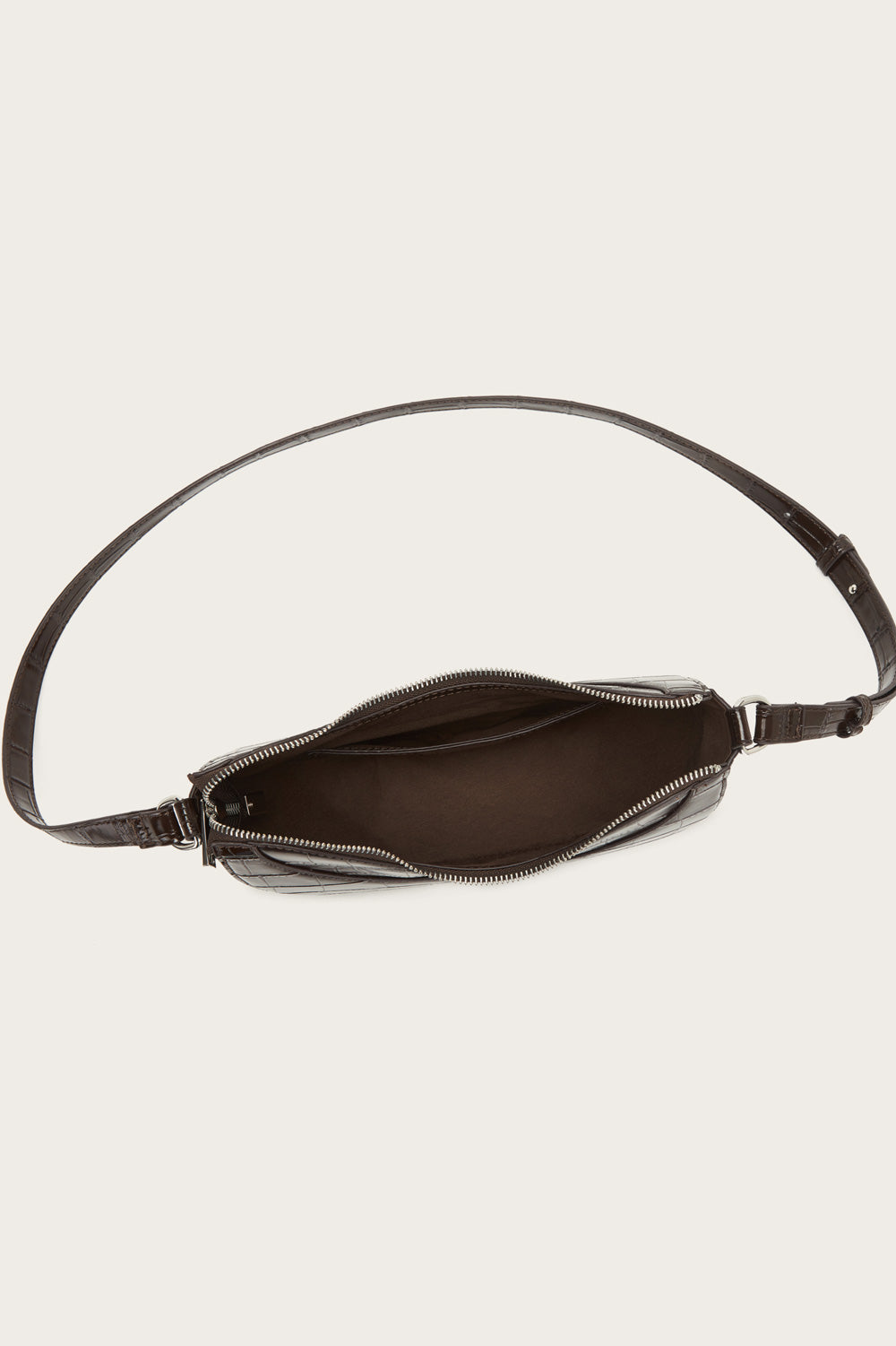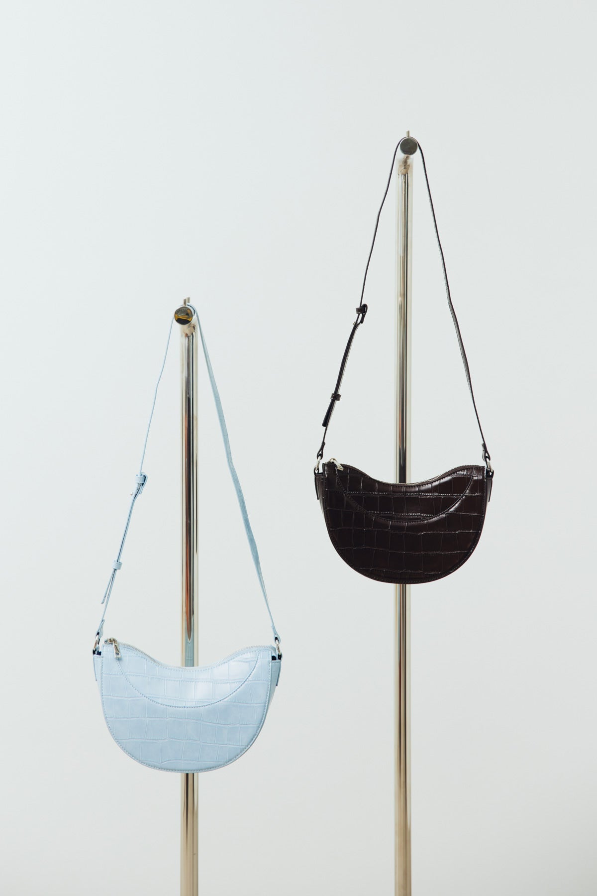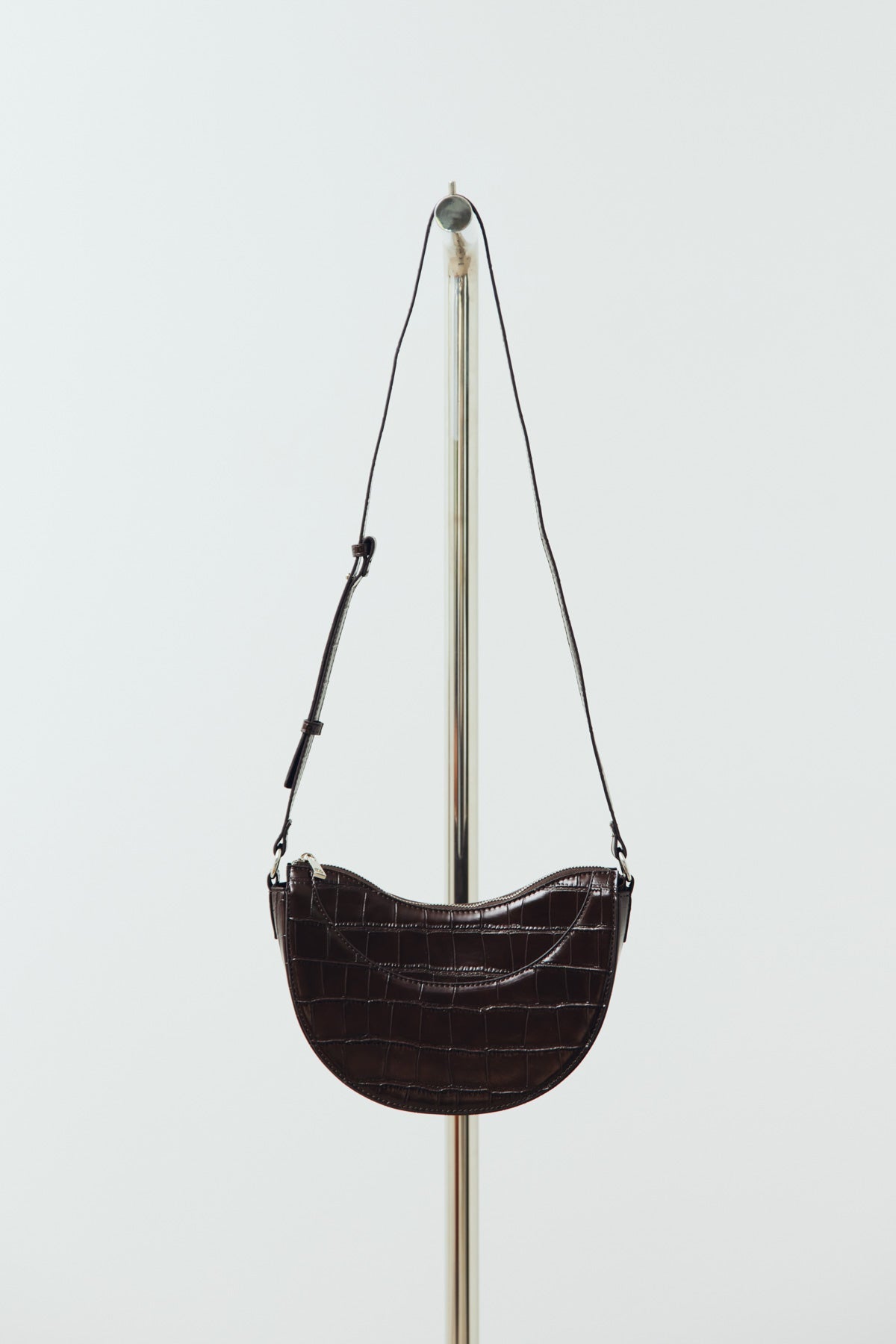 A sleek crescent-shaped bag in PU with a croc-embossed finish that adds texture and edge. Designed with an adjustable shoulder strap, it can be worn crossbody or over the shoulder for versatile styling. The zip closure keeps your essentials secure, while the compact size makes it perfect for day-to-night wear.