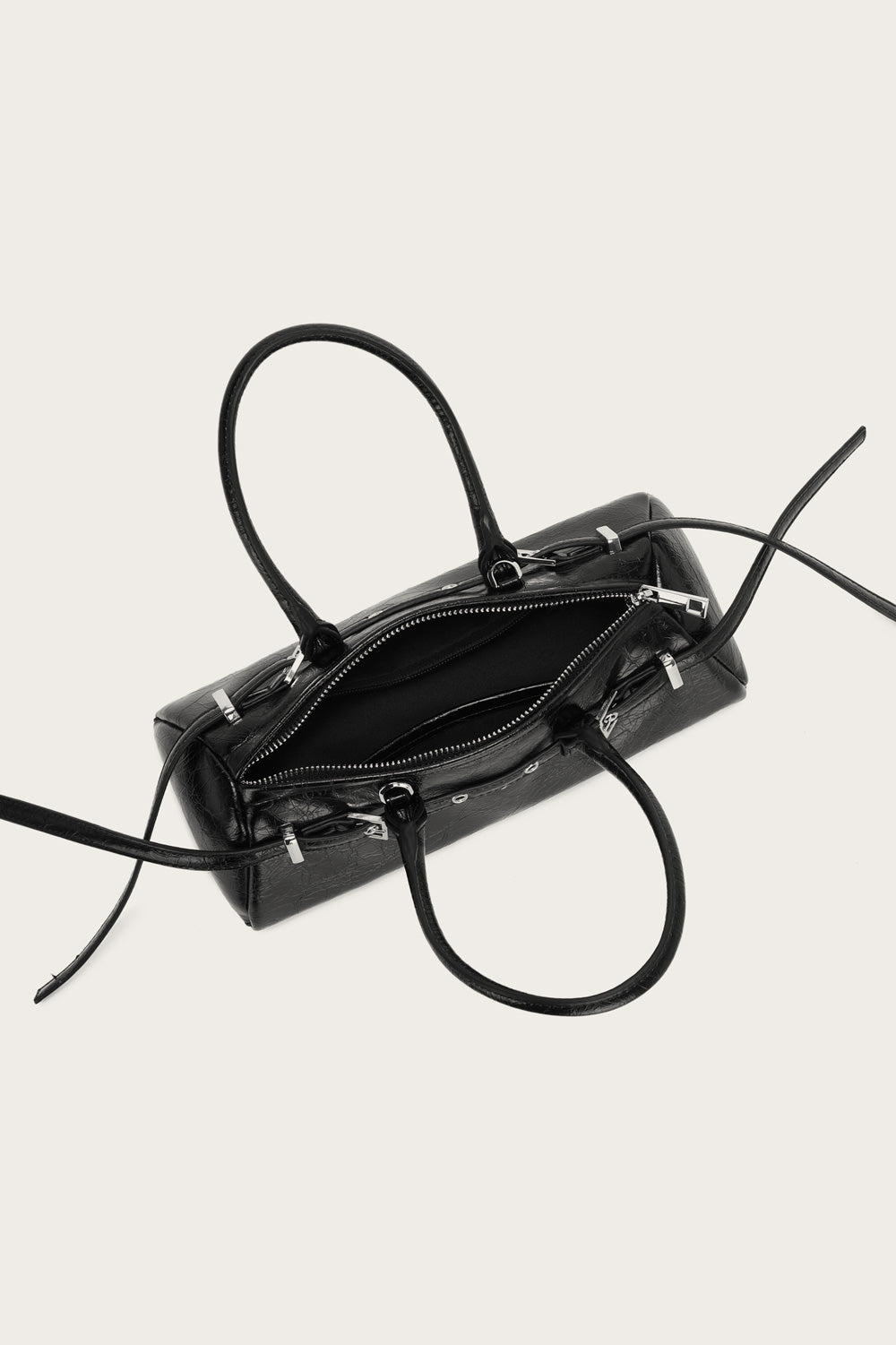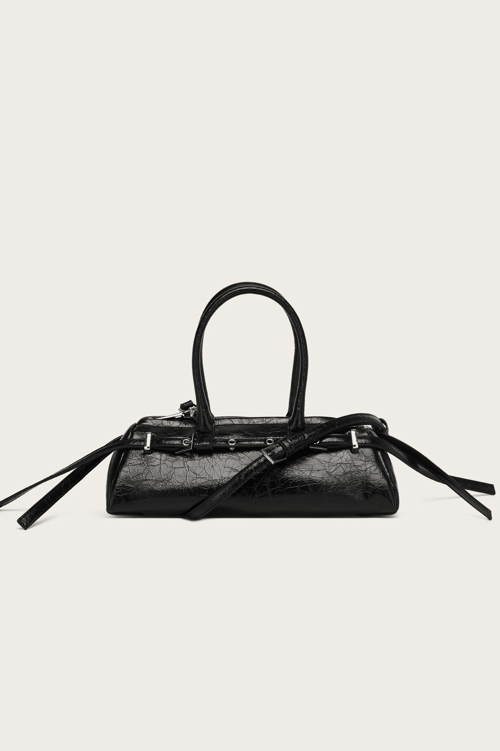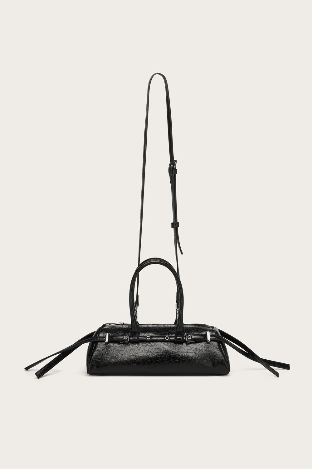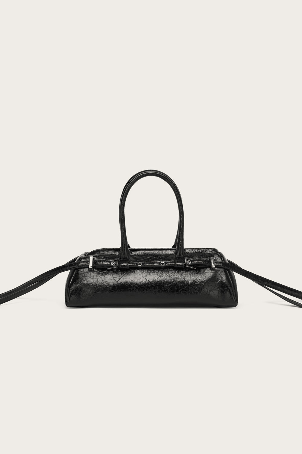 Small bag in distressed leather look with smaller buckles Geproduceerd in: 100% PolyesterKleur: SortArtikelnummer: 13580003